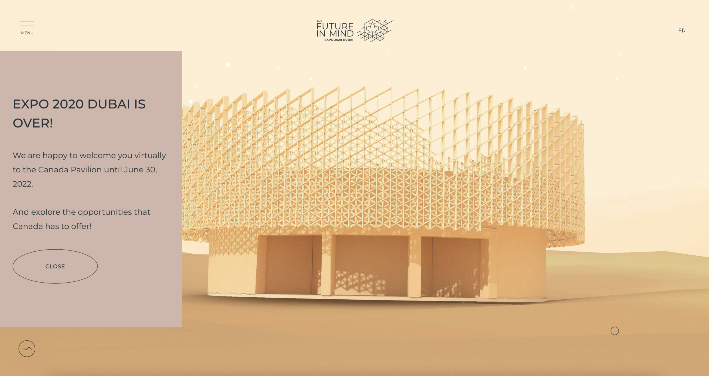 The nominated webpage features a fly-through web design showcasing the Expo 2020 Dubai Canada Pavilion + explains key details about the interior exhibit.