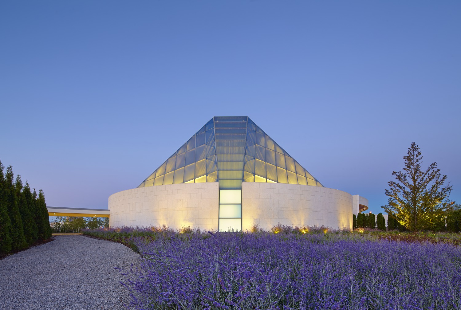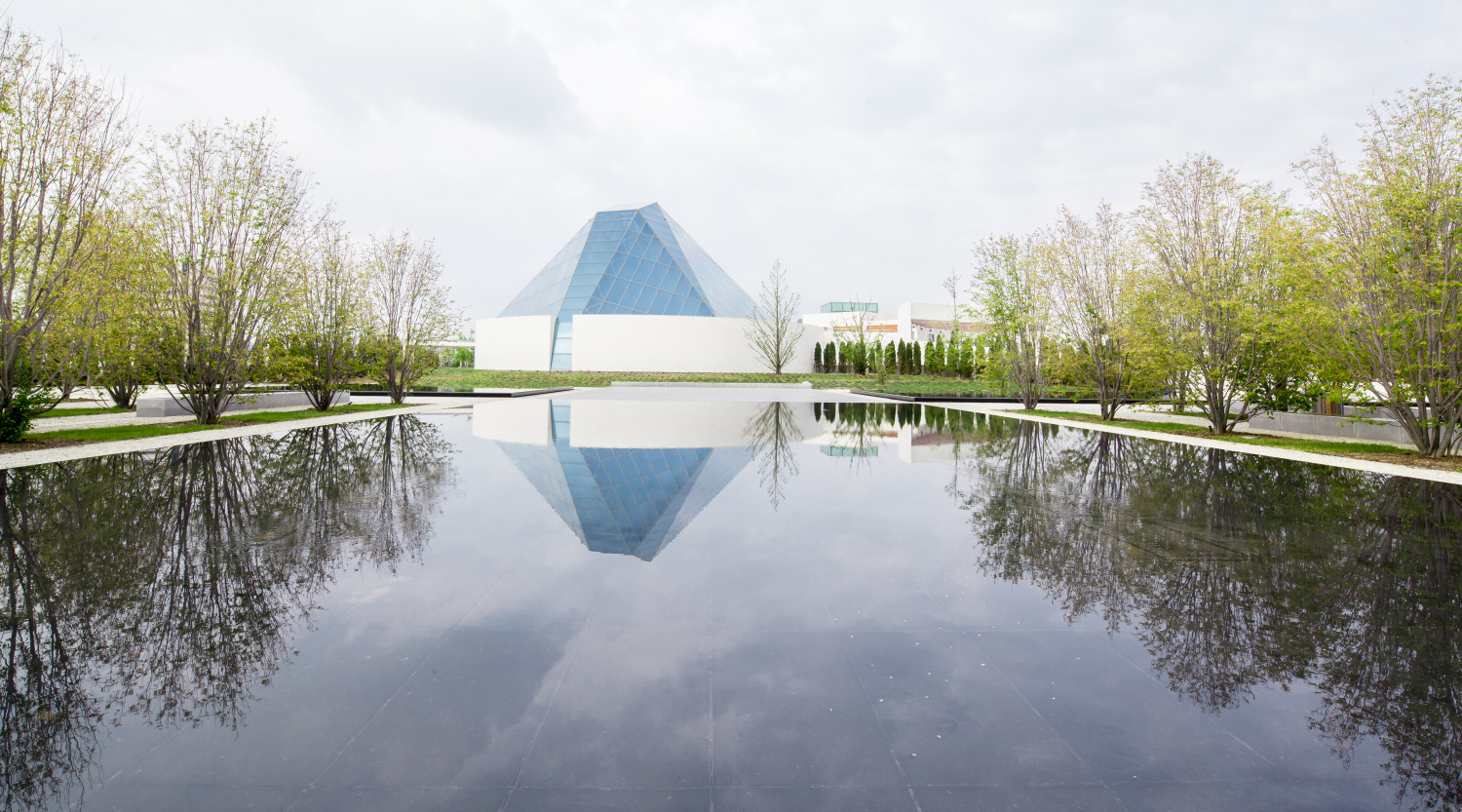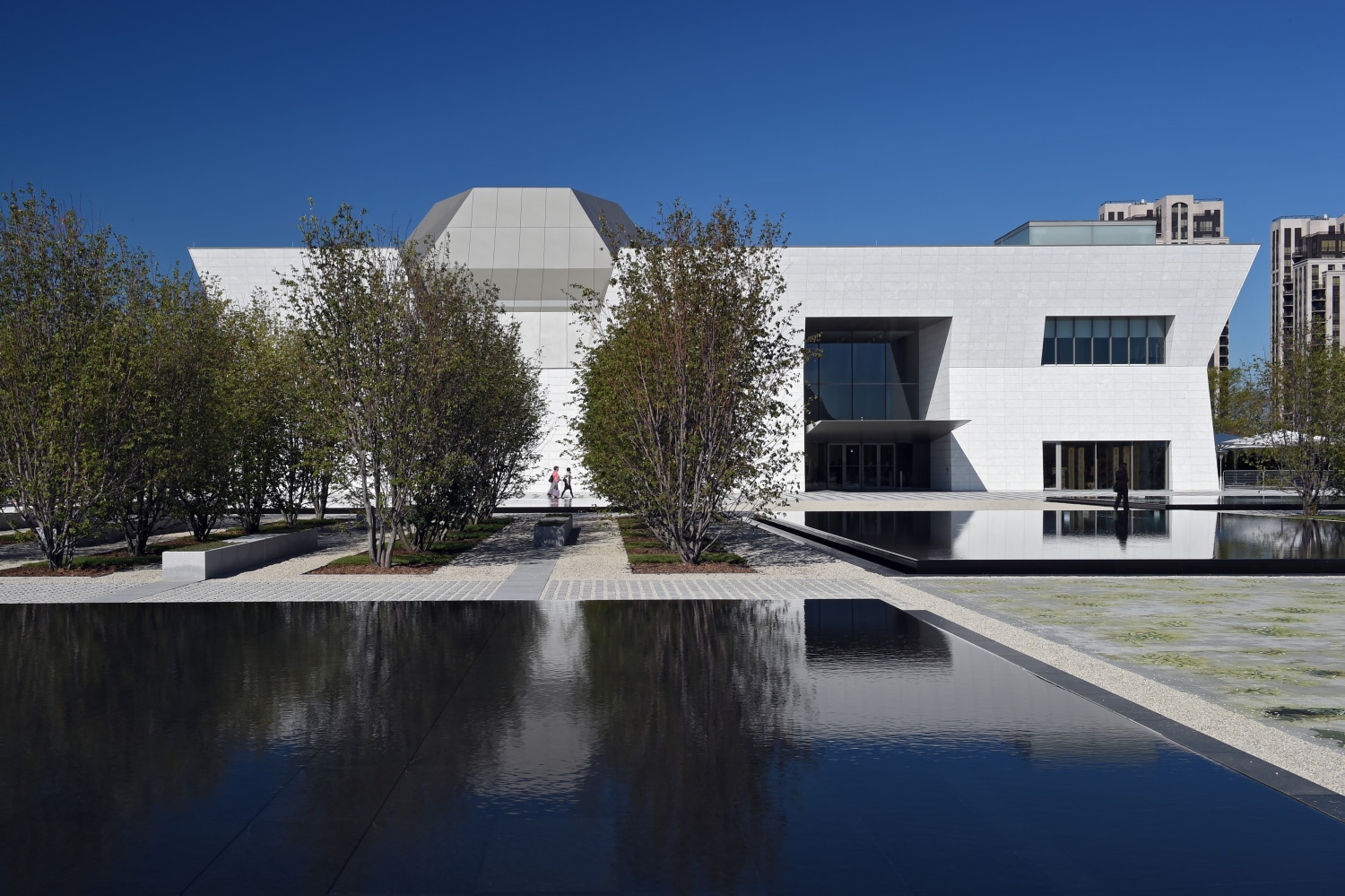 Pictured here is the Aga Khan Museum (designed with Maki and Associates) and the Ismaili Centre (designed with Charles Correa Associates) located adjacent to the Don Valley in Toronto. These two cultural buildings are surrounded by the stunning landscape of Wynford Park. This 7-acre site is unified by walking paths winding through naturalized woodlands, while traditional Islamic gardens with formal rows of trees, fountains, and reflecting pools provide quiet, contemplative, outdoor spaces.