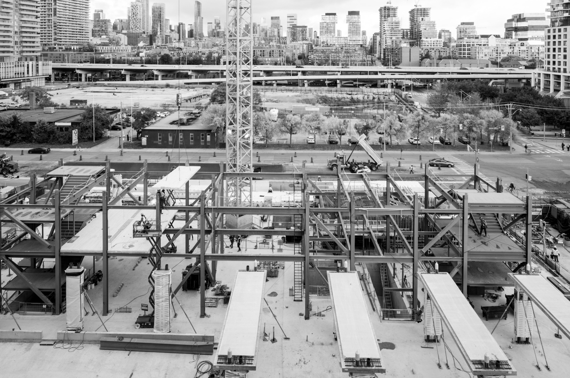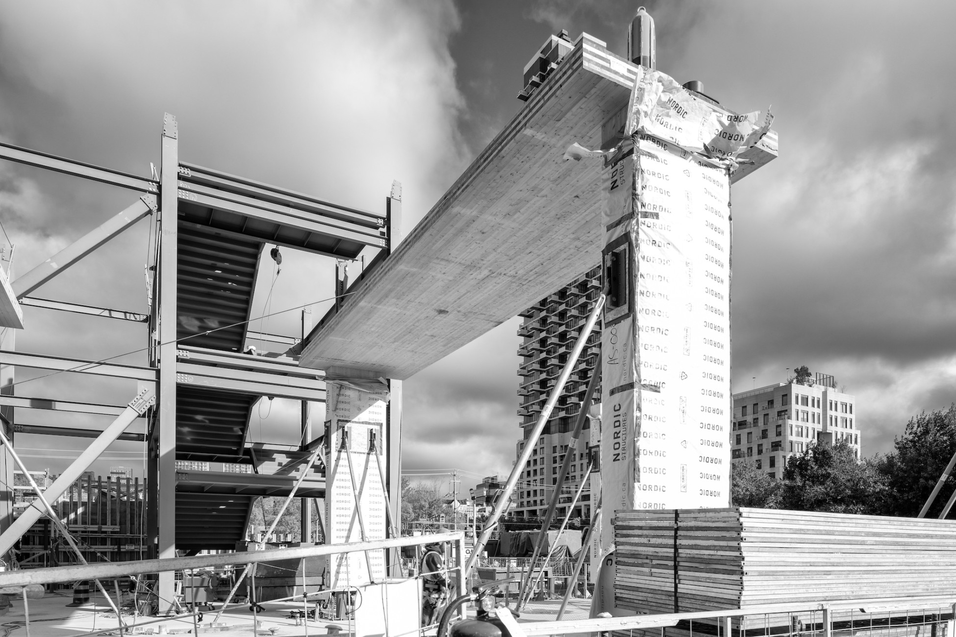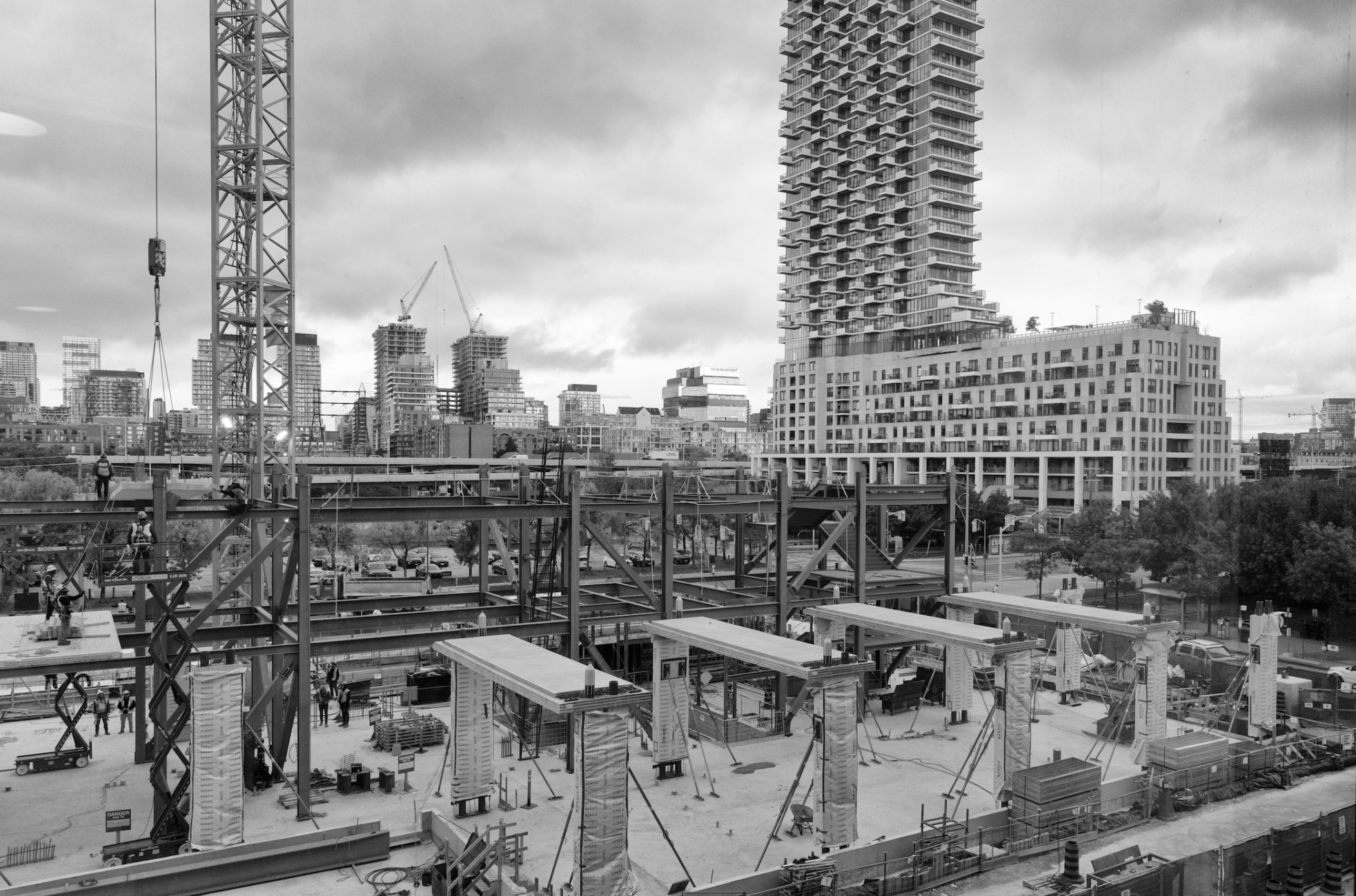 Fall update on the progress occurring at the construction site of Limberlost Place at George Brown College’s Waterfront campus – See photographer Salina Kassam’s most recent photographs here, capturing moments of structural members rising throughout the first, second, and third floors of the building. The 9.2 x 7.2 metre grid is beginning to take shape across Limberlost Place’s footprint, with glulam columns, CLT slab bands and infill floor panels now being set in place.
