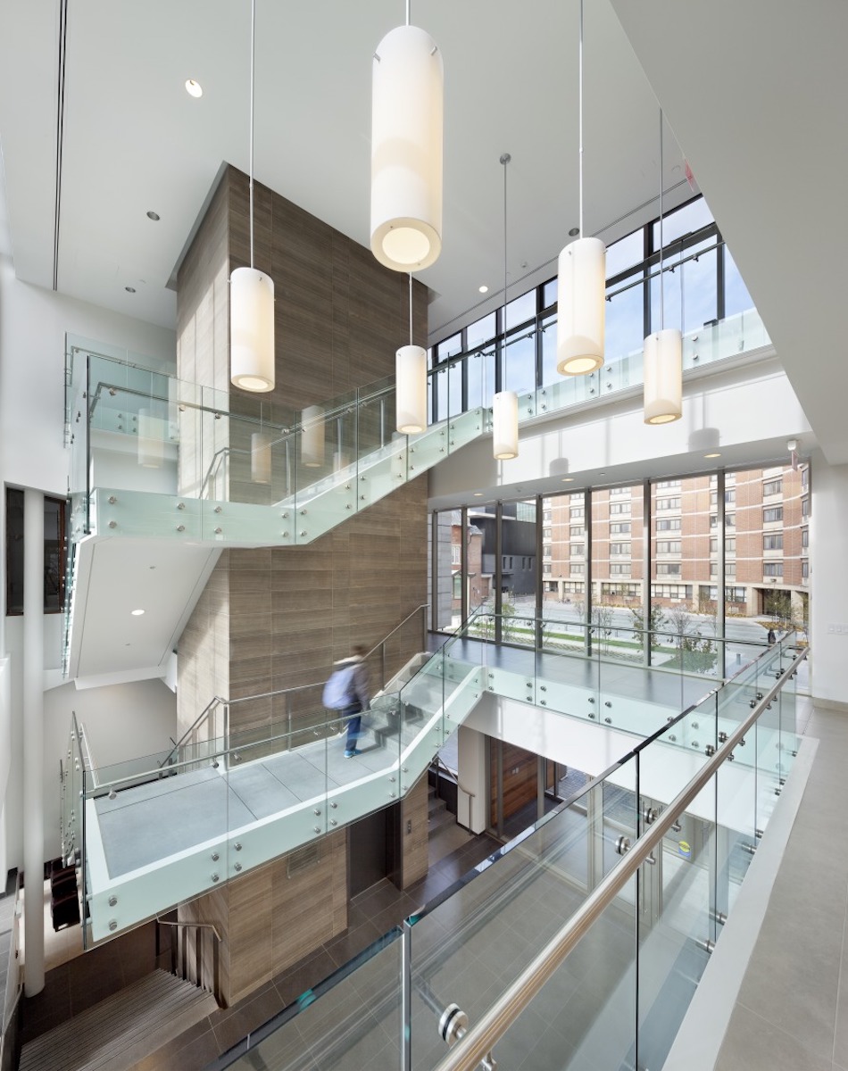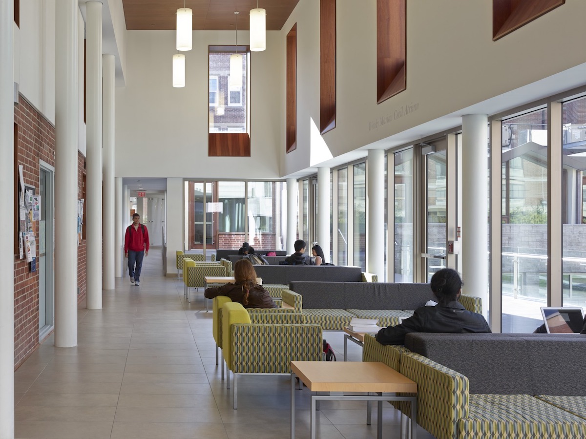 The Goldring Student Centre at Victoria University (the oldest college in the University of Toronto) is a renovation and 40,000 SF addition to Eric Arthur’s Wymilwood Building, which doubled the size of the original building and introduced contemporary and accessible student and administrative spaces. The primary spaces overlook the beautiful, outdoor quad, which is the heart of the project, and was made possible by the relocation of an access road that previously ran through the site. This allowed the design team to introduce a new green space that connects the building to nature and to the adjacent student residence. The porous, welcoming, and animated ground plane reinforces pedestrian routes through the campus, and attracts students into the building’s exceptional interior and exterior spaces.
