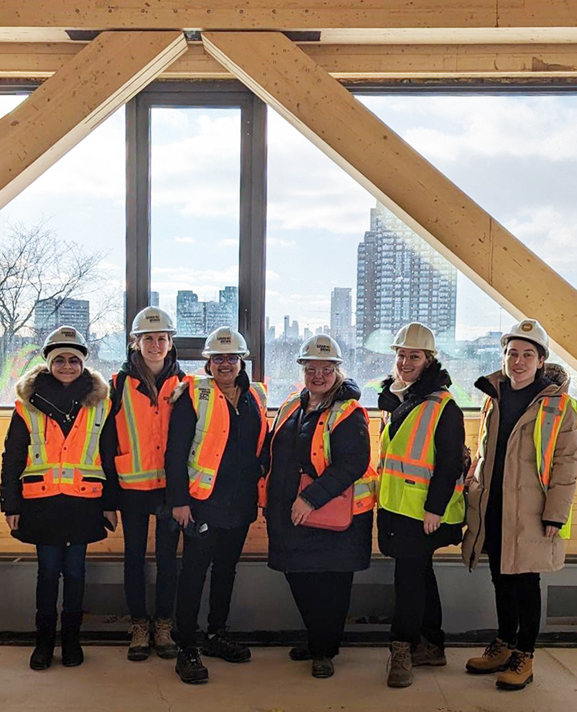 Wood Works! Canada recently organized a tour of our project, the Ontario Secondary Schools Teachers’ Federation (OSSTF/FEESO) Headquarters and Multi-Tenant Commercial Building, which is currently under construction in Toronto. Representatives from Govan Brown were in attendance, as well as MTA’s Cathy McMahon, Associate, and Deya Iskandarova, Architect, who both contributed to the architectural design of this innovative, highly sustainable, mass timber project.