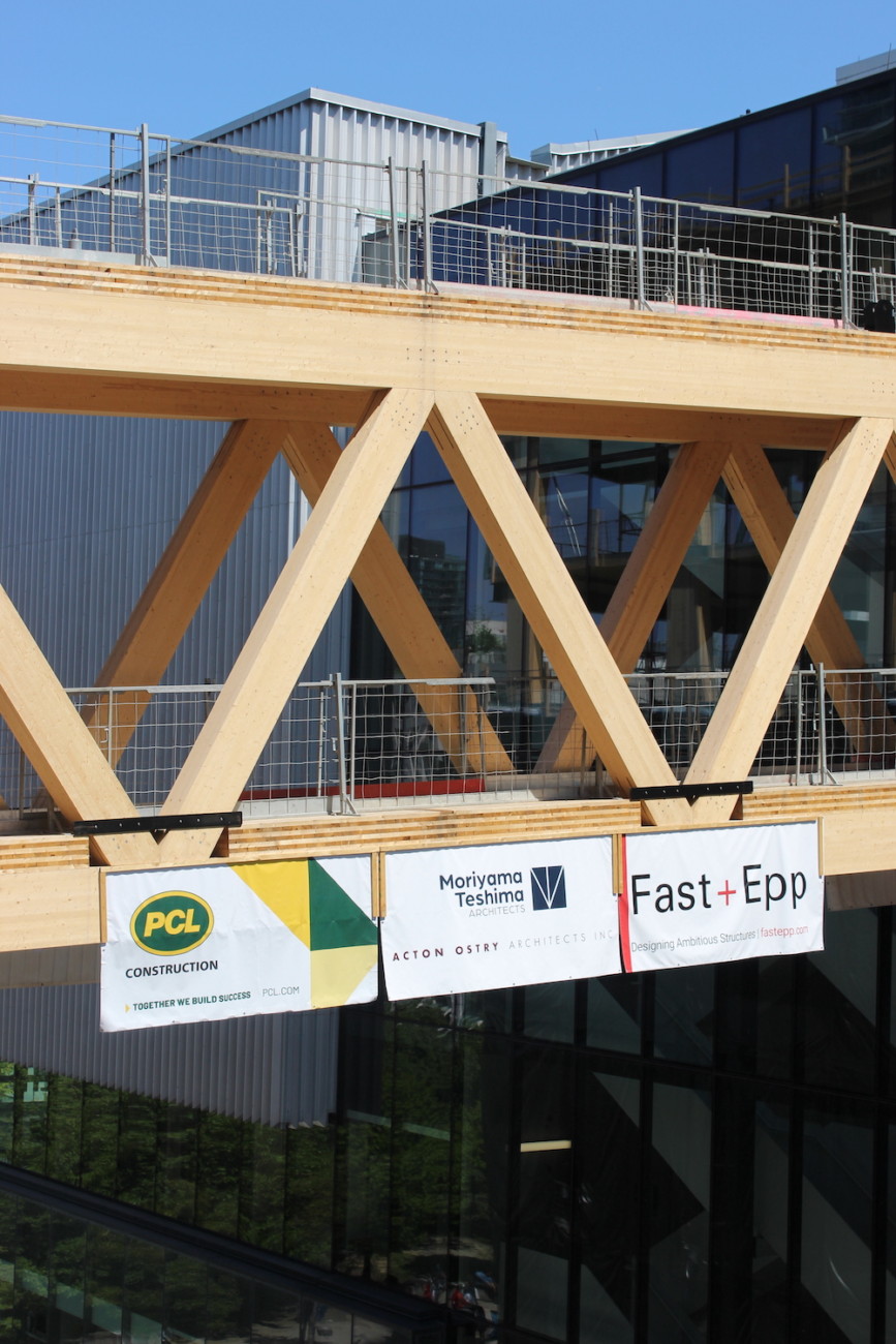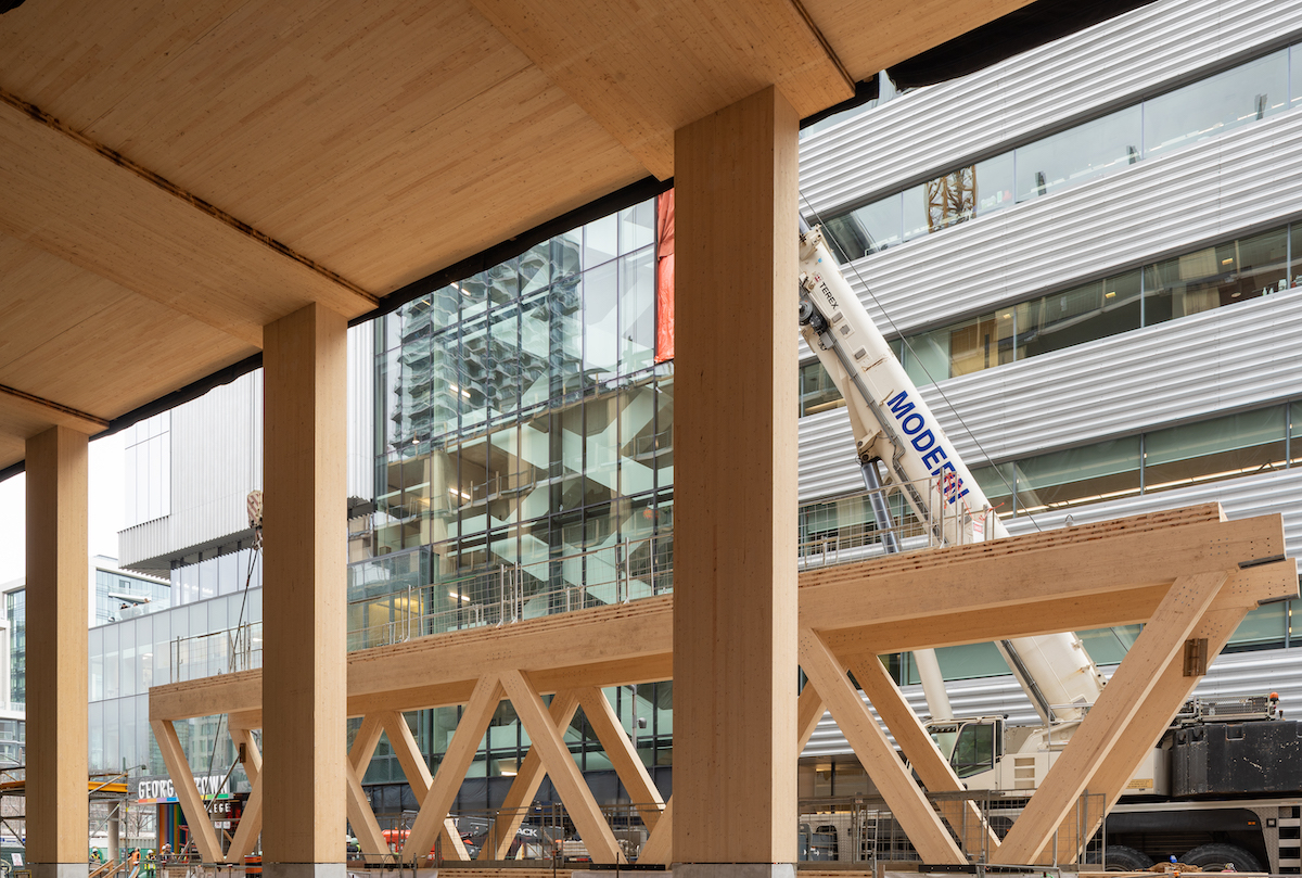Designed by Moriyama Teshima Architects and Acton Ostry Architects and hoisted into place in March of 2023 at George Brown College’s Waterfront Campus in Toronto, it is one of a select few fully mass timber bridges at height in North America (using no steel in its structural composition). The bridge was set at level 5 to align with the termination floor of the main feature stair inside Limberlost Place, serving as a pedestrian connection from the ground floor all the way up and into the neighbouring Daphne Cockwell building. Spanning 70 feet and weighing 70,000lbs, it was assembled on site over four days, and raised on the fifth.