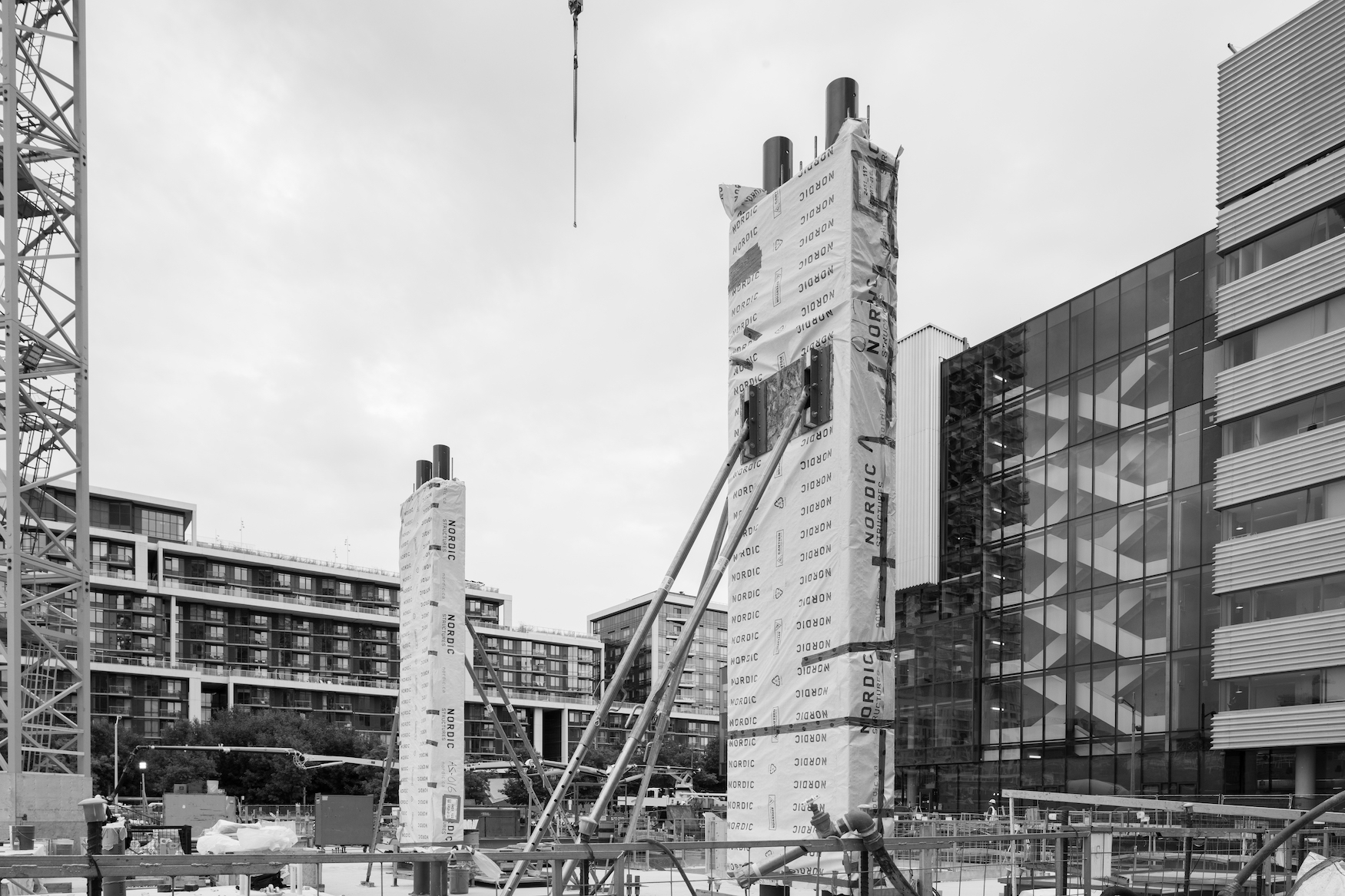 The final concrete pour for the Level 1 suspended slab helps top off the below grade work, and makes way for the first glulam timber columns to be erected. With all permits in place, the timber structure and steel core will begin to rise at a rapid pace. More coverage to come in the weeks ahead.