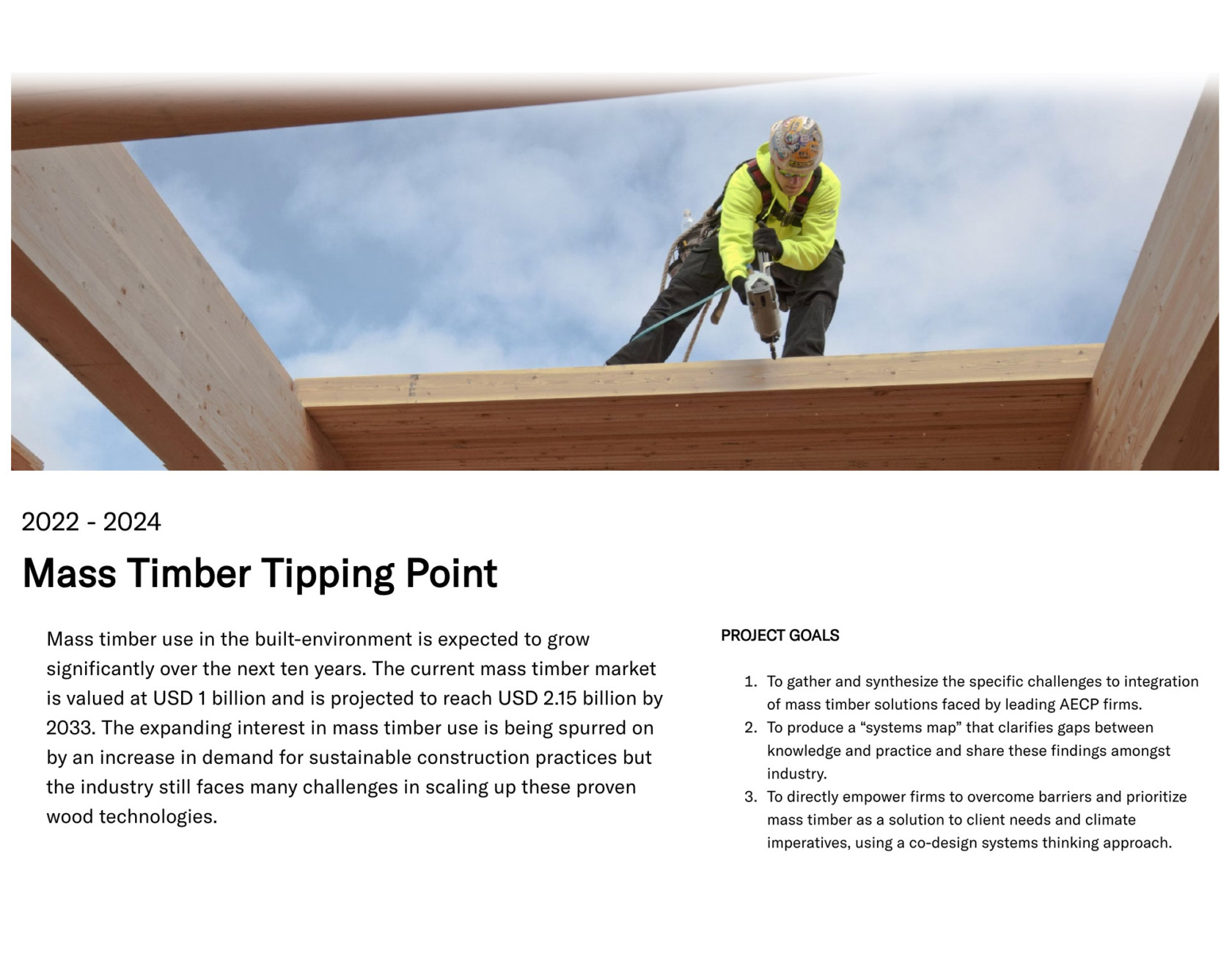 The Mass Timber Tipping Point is a two-year endeavour led by Pilot Projects Design Collective and Architecture 2030 that involves a collaboration with a select number of North American Architecture, Engineering, Construction and Planning (AECP) firms, with support from the US Forestry Service. The goal is to deeply explore diverse firm experiences with mass timber as an alternative low-carbon and carbon-storing material for commercial, institutional, and multi-family buildings in the interest of accelerating uptake.