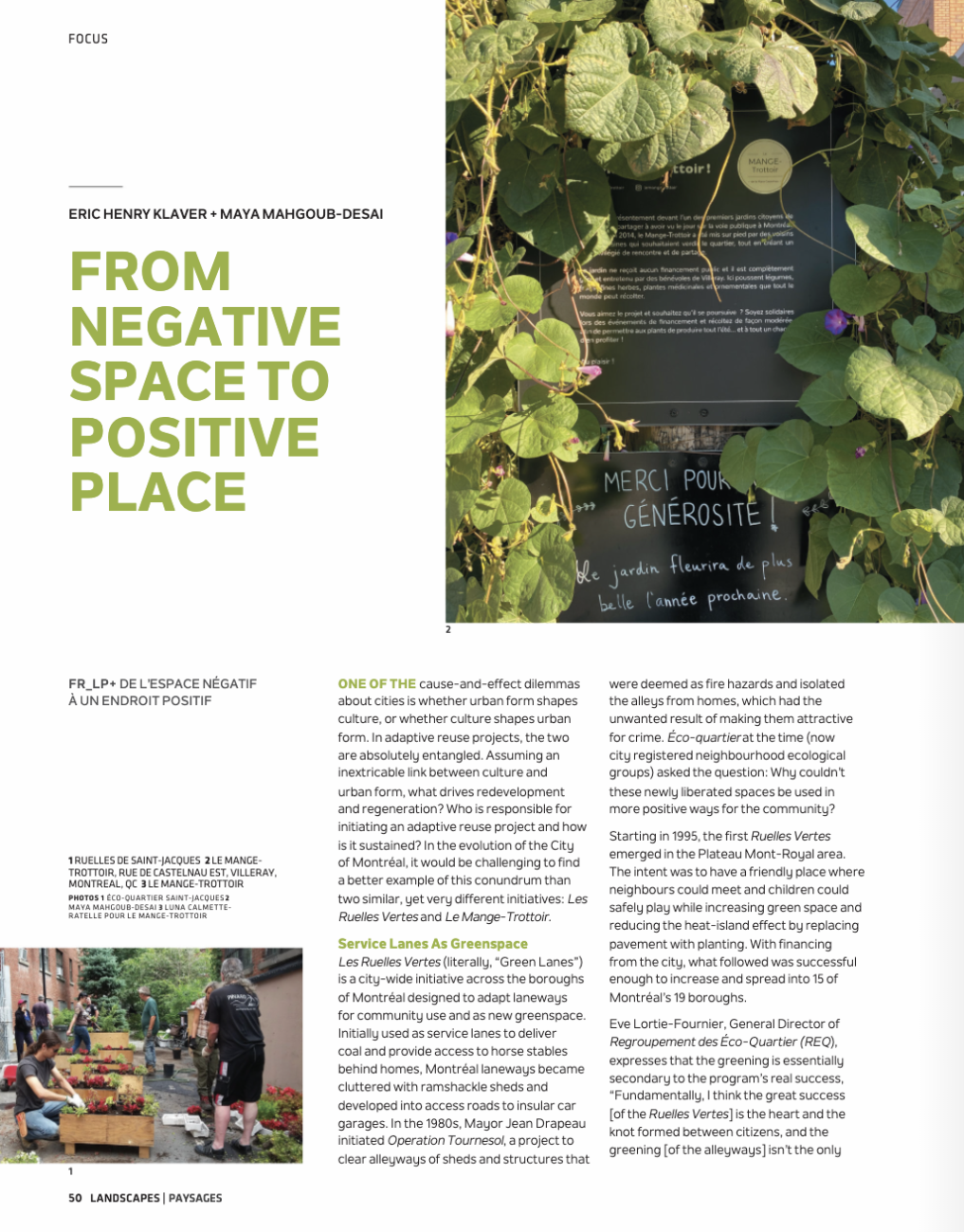 “From Negative Space to Positive Place”, an analysis of community-based green space strategies in Montreal, covers a number of key urban design issues and innovations, with topics ranging from adaptive reuse strategies, city greening, and urban farming. Environmentally-conscious design leaders like Maya are expanding the horizons of how 21st century cities can design and implement equitable open space.
