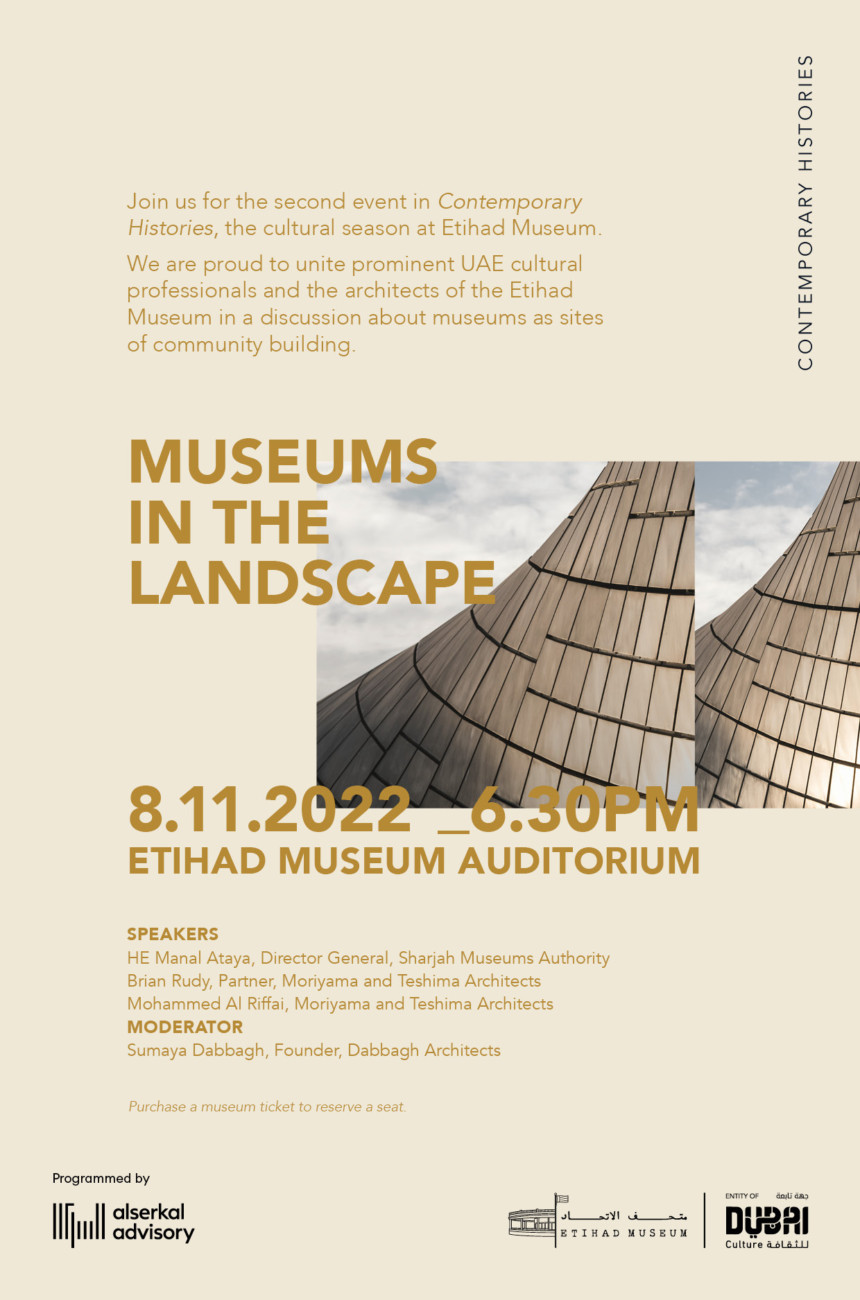 Hosted at the museum, the talk will be the first in a series (“Museums in the Landscape”) about how to re-imagine cultural facilities in Dubai, as spaces for community, public engagement, and transfer of knowledge. Brian and Mohammed’s talk will be focused on how the Etihad, completed in 2016, is a prime example of this, explaining how the museum was designed to anticipate and accommodate enhanced visitor experience. They will also be leading an architectural tour of the building during this event.