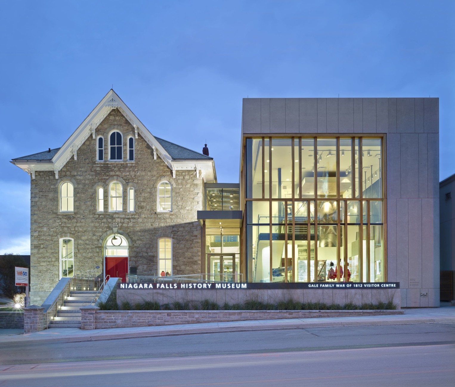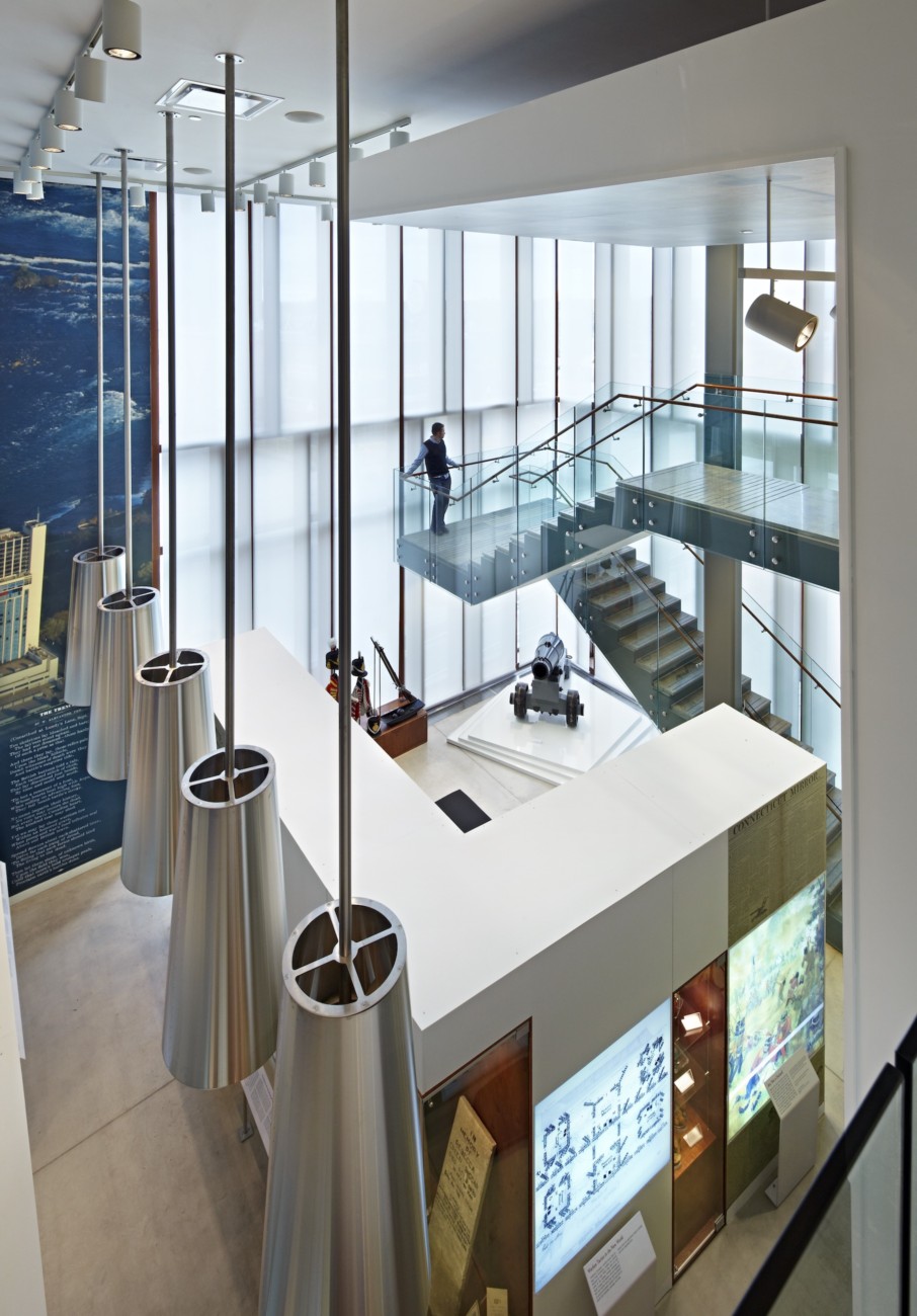 The Niagara Falls History Museum celebrates the history of the City of Niagara Falls and commemorates the Battle of Lundy’s Lane, a pivotal battle in the War of 1812 that halted the American advance into Upper Canada and ensured the survival of Canada as a sovereign nation. To support the museum’s expanded mandate as a national cultural institution, Moriyama & Teshima Architects led a heritage restoration of the existing museum building, the 1874 Old Stamford Town Hall, and designed a 10,000 square-foot expansion that more than doubled the museum’s size, creating much-needed new exhibition and archival spaces. New facilities include a two-storey permanent gallery, a temporary gallery, a 75-seat theatre, archival facilities, administrative offices and a glass entrance atrium that doubles as an event space.
