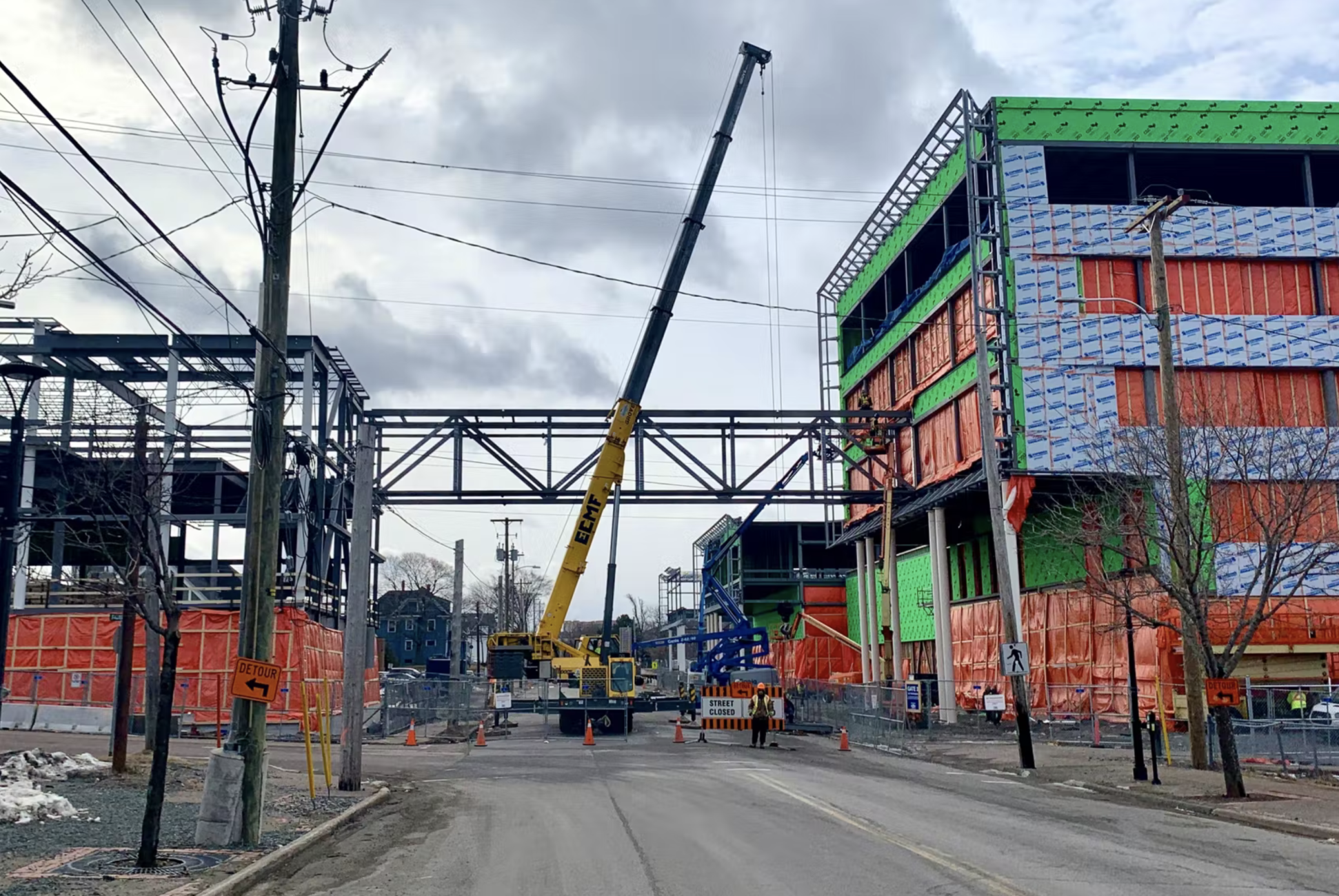 It is very exciting to witness the major advancements of the Nova Scotia Community College construction site at Sydney’s waterfront! Read the Saltwire news article linked here to see framework of the suspended pedestrian walkway bridge (connecting two of the new campus buildings) being positioned.