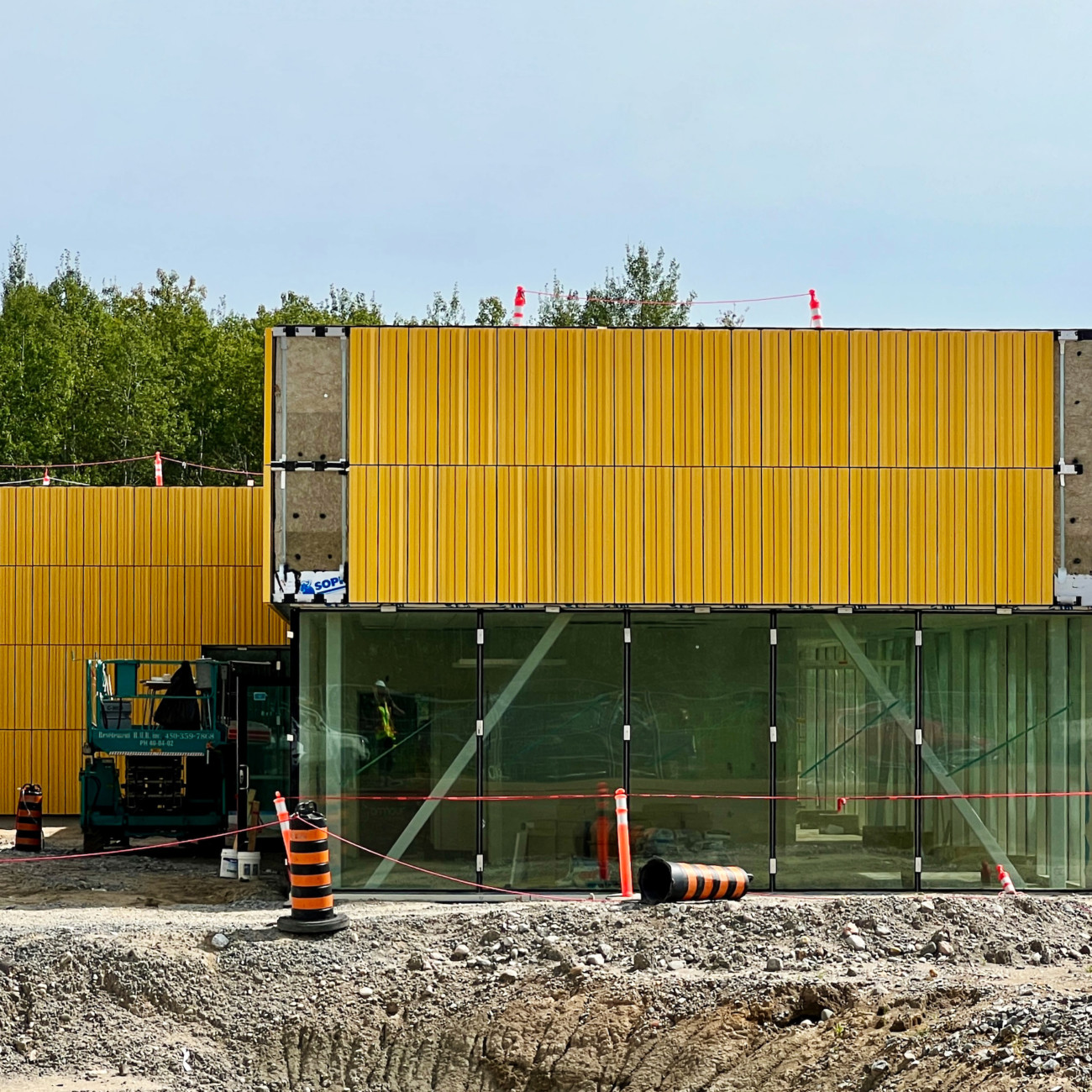 As seen in the following photographs, the office block, contrastingly, is clad in a profiled fluted and textured terracotta panel. Terracotta was selected for its elevated levels of durability: a critical design parameter for a collection facility, but also for its low carbon footprint. The panels are glazed in a golden yellow colour, which is reminiscent of a birch forest in the fall season. This material also deeply resonated amongst the Parks Canada specialists, drawing parallels with Park Canada’s large collection of earthen wares from archeological digs and assets from the National historic sites.