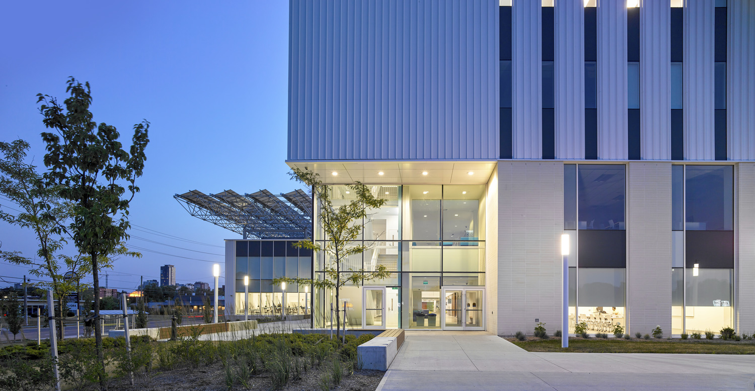 The Conestoga College North Campus Expansion project, completed by Moriyama Teshima Architects and Gow Hastings Architects in 2019, is a 4-storey addition to the south side of a former secondary school which houses construction and culinary trades programs, including the Centre for Food Innovation and Hospitality Management.