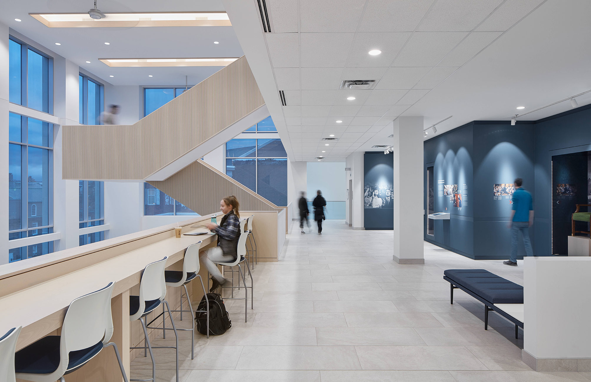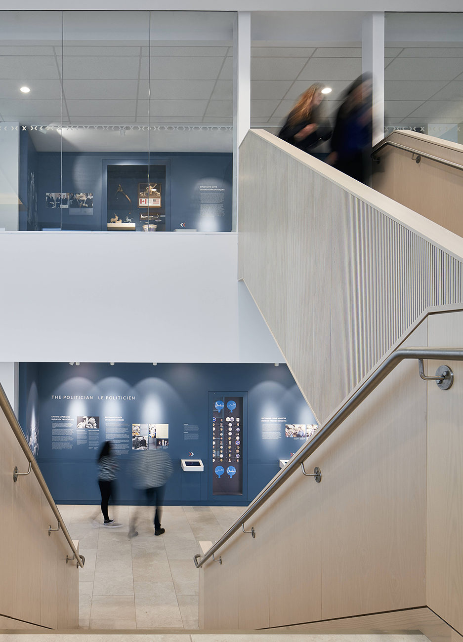 The grand, warm and inviting Lobby space provides direct access to the PM’s Replica Office, Temporary Gallery, and Scholar’s Walk. The Chamber is the first of three ‘Pod’ projections along Scholar’s Walk, followed by Digital Archives and Studio. Casual lounge and Interactive Learning Spaces are interspersed along the interior of Scholar’s Walk; generous amounts of glazing allow access to daylight, views and orientation, without concern of glare or heat gain to the occupied spaces. A generous Student Common includes Interactive Learning Spaces with group tables and connective and interactive technology.
