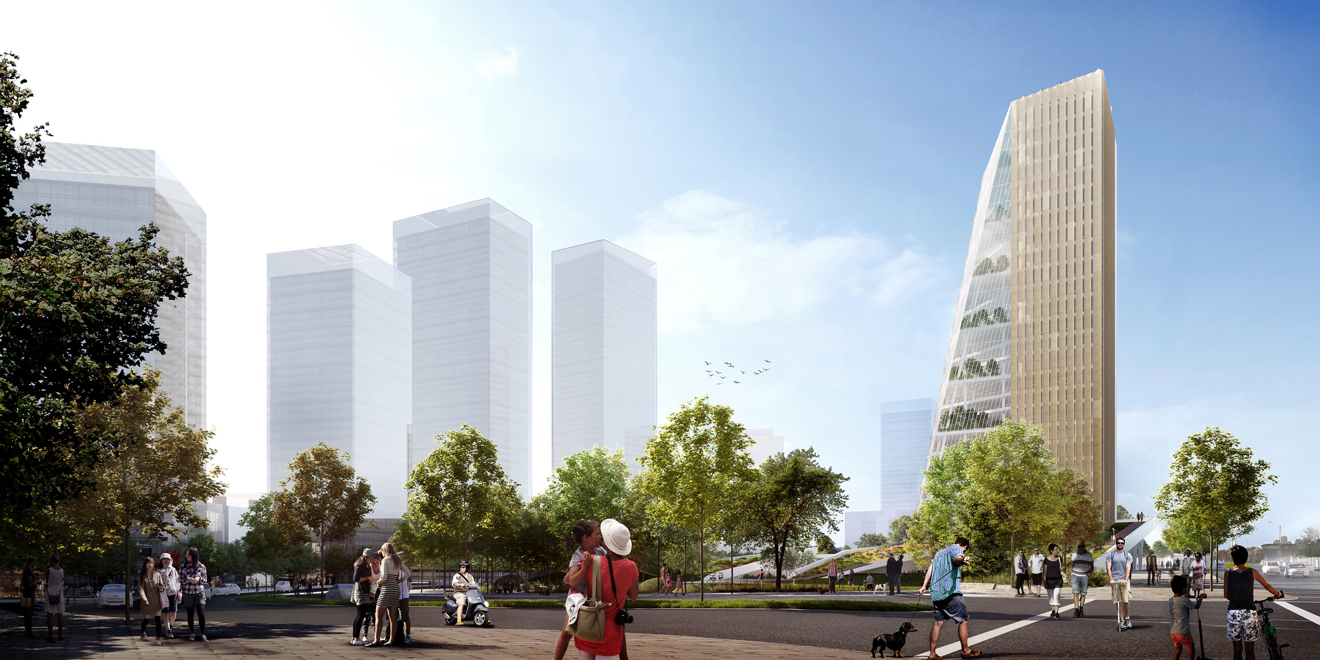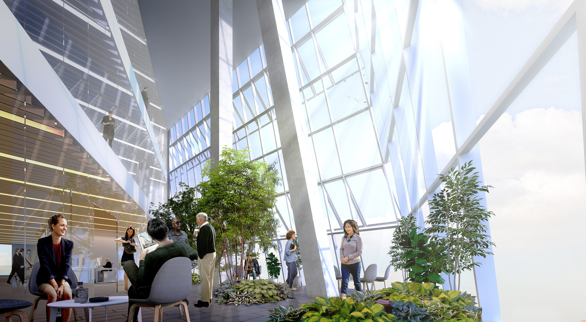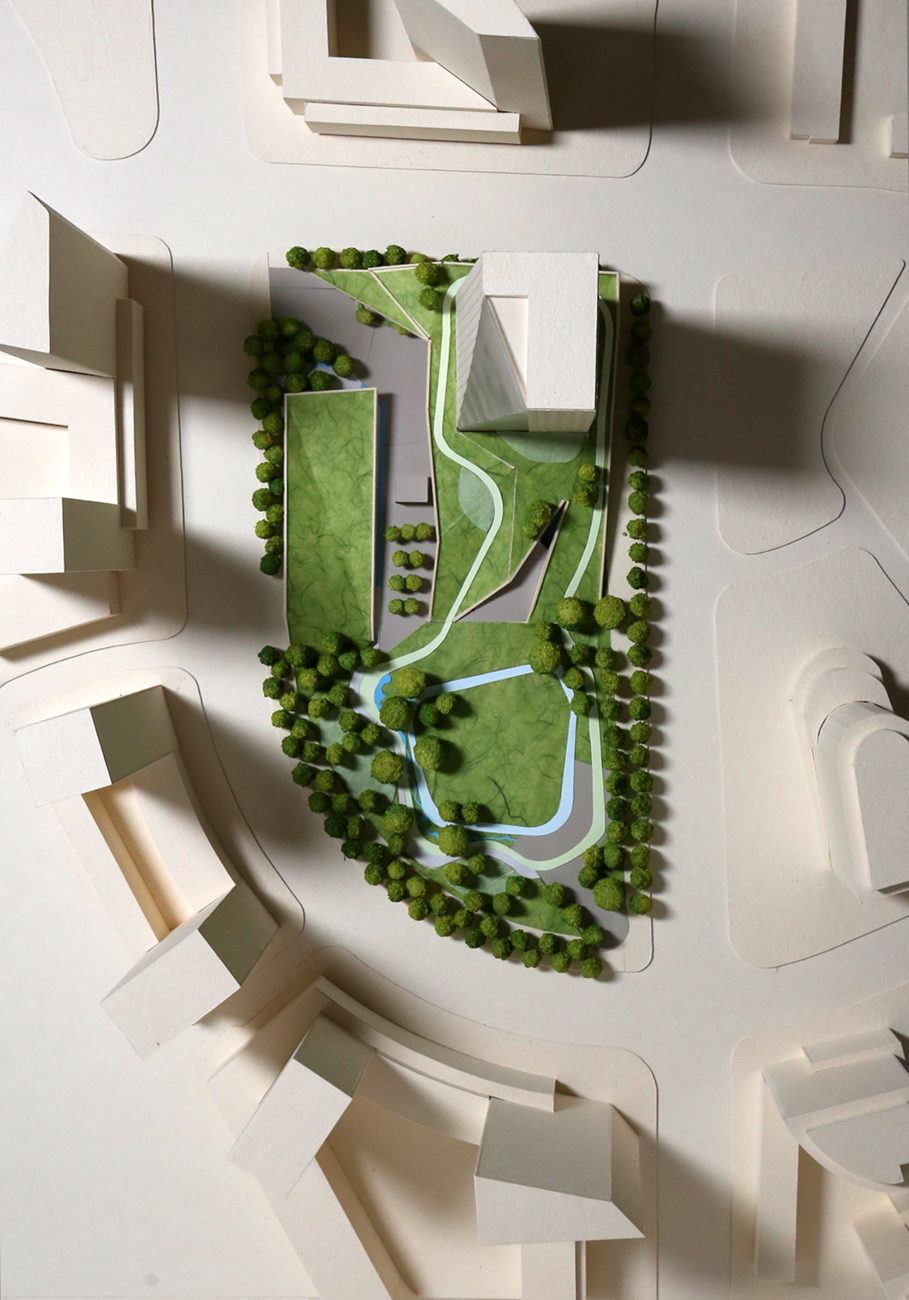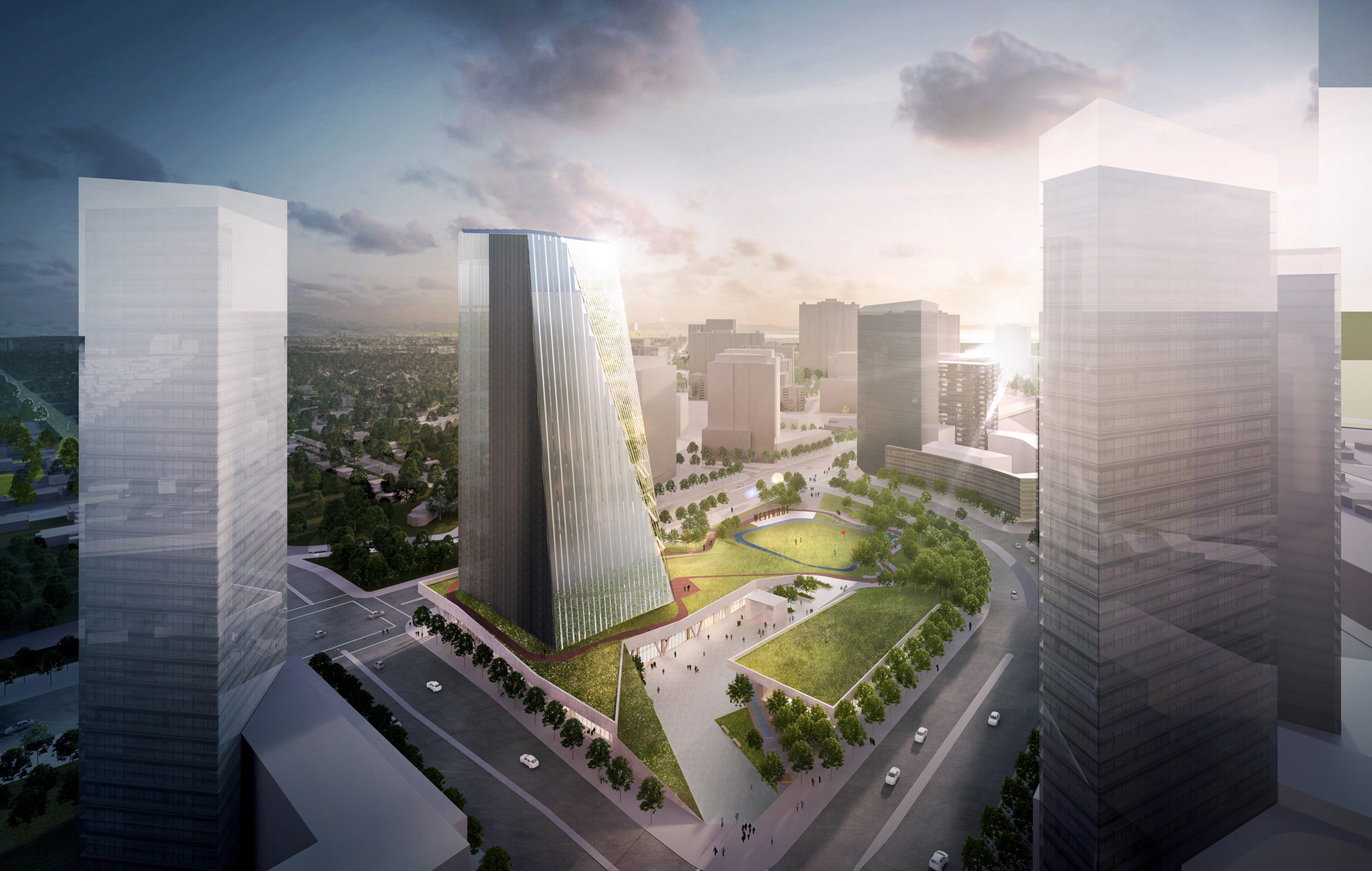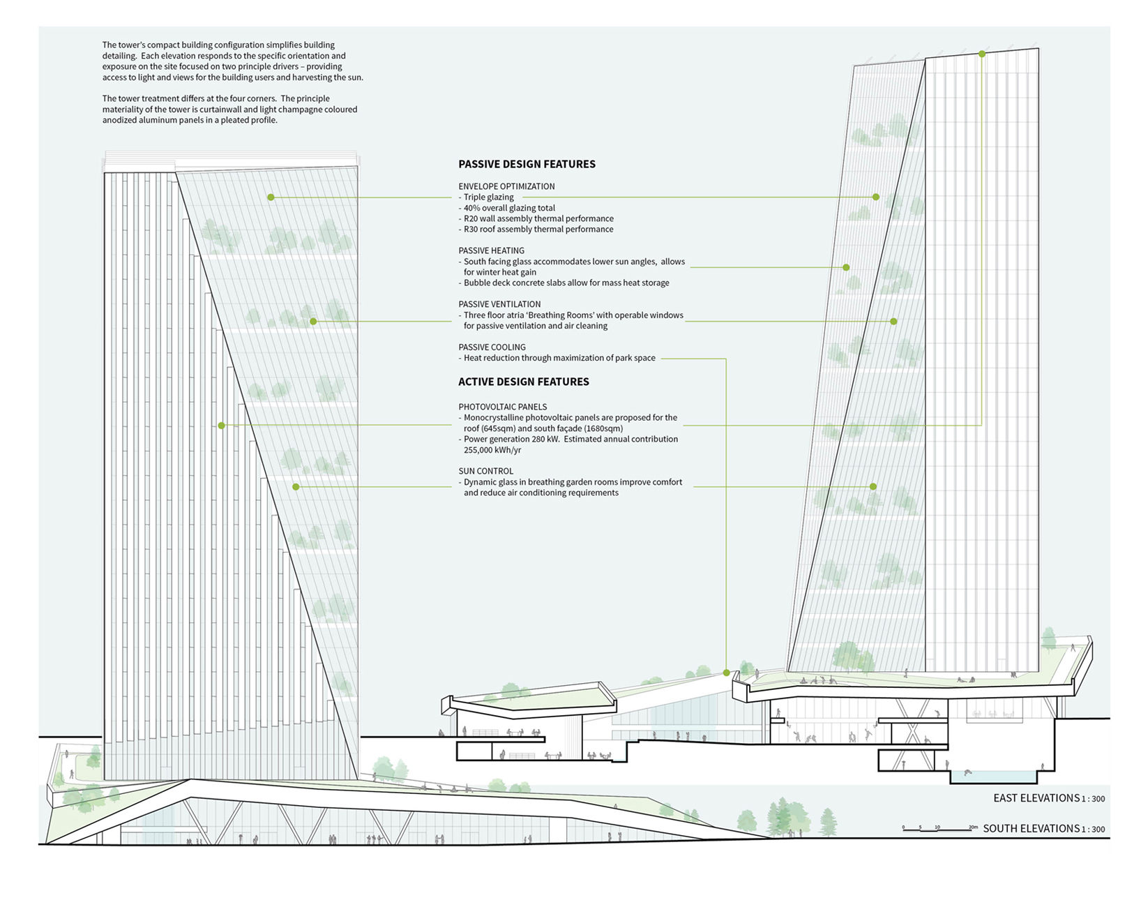 Tapering vertically and chamfered in plan, the tower presents a slimmer profile to the east in order to minimize shadows on the park and present a dramatic silhouette. Responding to the proposed park, the SE corner of the building continues the landscape through a series of repeating vertical gardens – three storey glass atria called ‘Breathing Rooms’. These present alternative working environments, contribute to the air quality in the tower and provide a connection to nature for the building occupants. The tower also acts as a power source for the site with solar thermal and photovoltaic panels integrated into the south and western façades and roof.