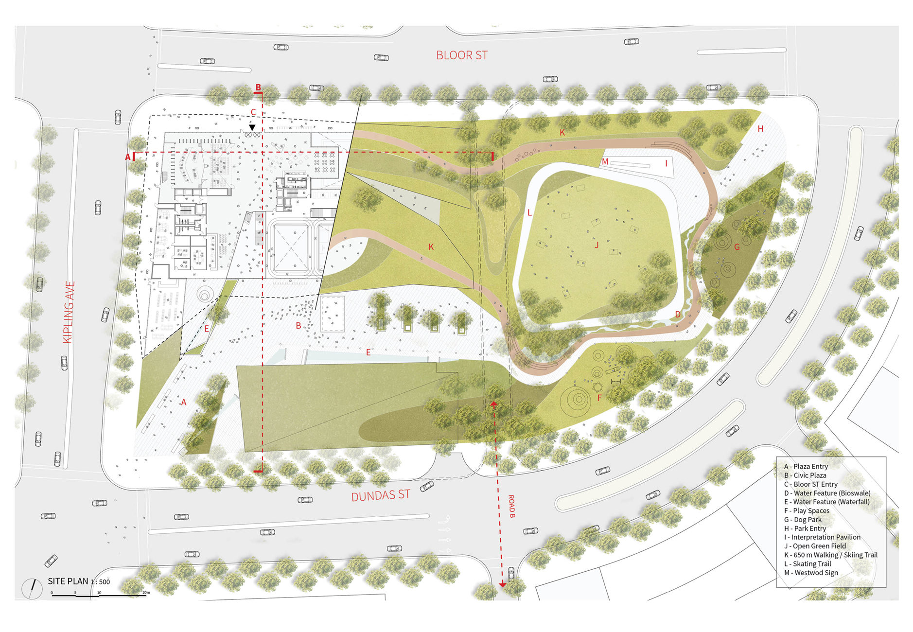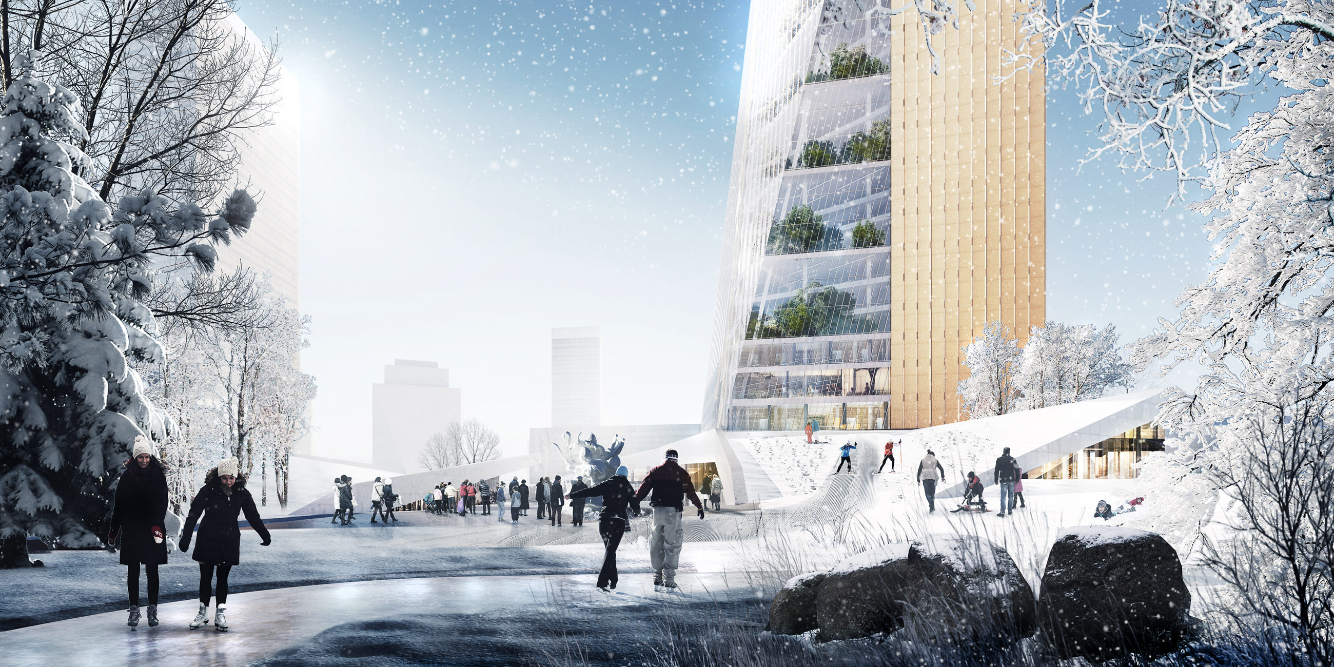Together, the building, public square and park act as a social condenser, with space to allow the diverse population to gather, interact, learn and enjoy. A clearing in the forest provides an outdoor space for active sport and public gathering, a green counterpoint to the civic square, and a 650 metre walking/skiing trail that circumnavigates the park and tower, providing rich views and experiences for the Etobicoke area’s growing population.