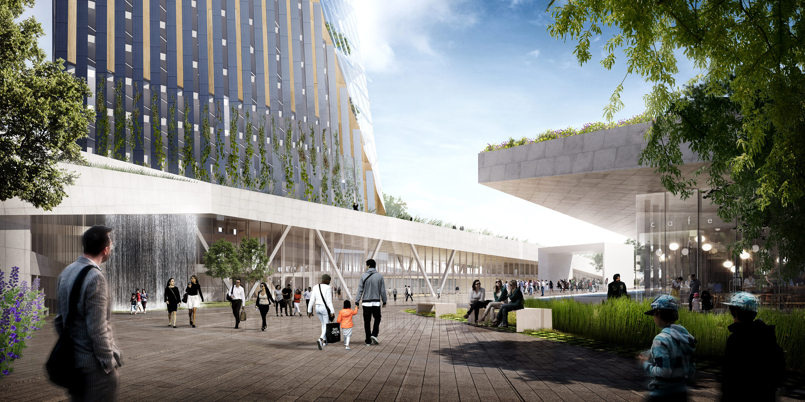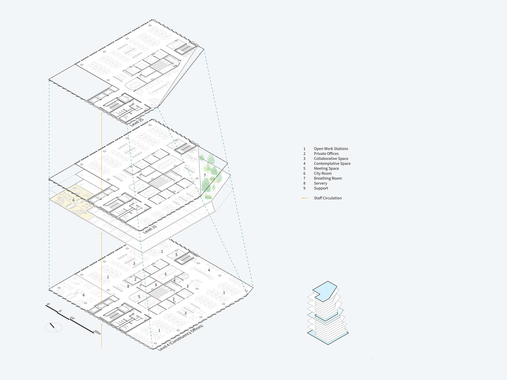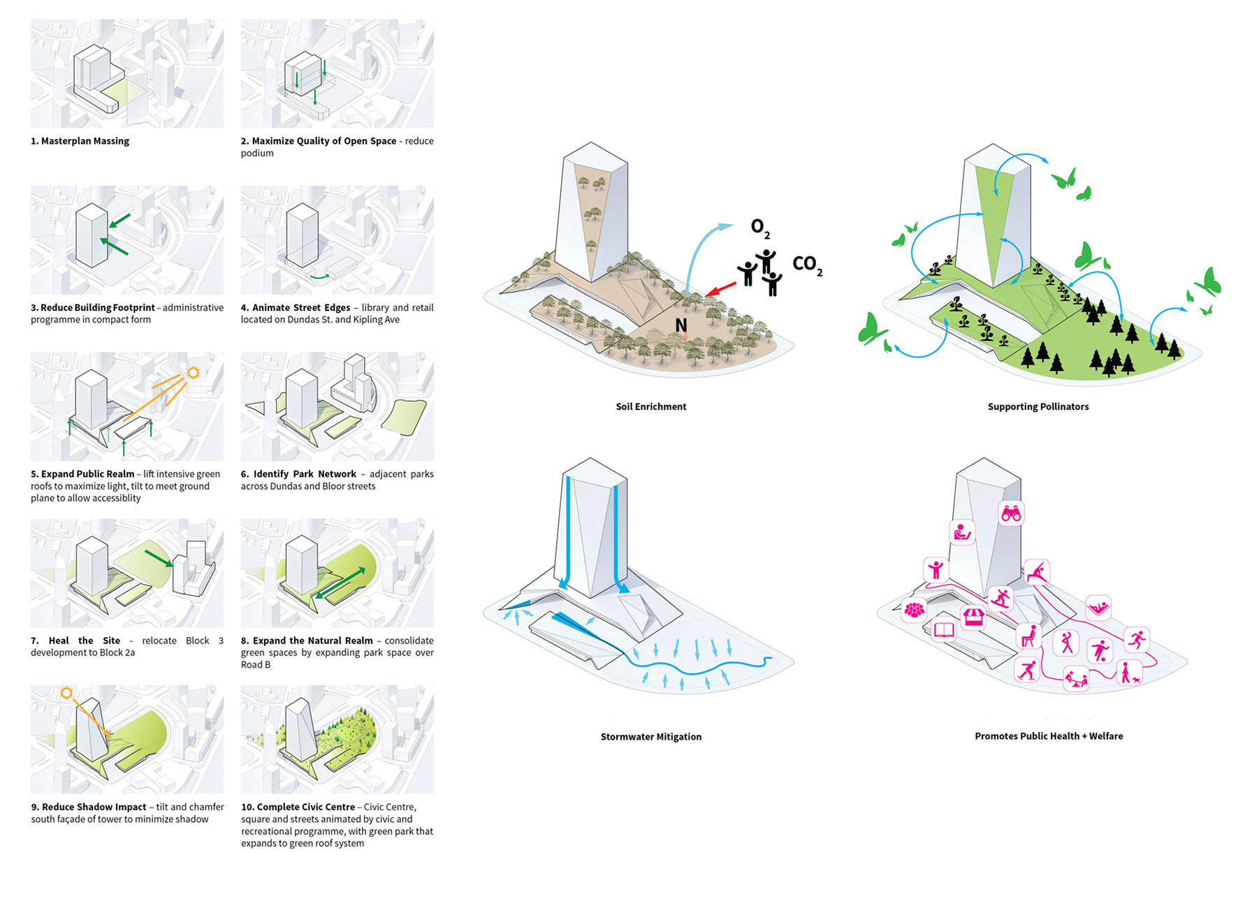 The proposed vision for the Etobicoke Civic Centre in the Westwood Theatre Lands district amalgamates civic, recreational, and workspace programs through the integration of generous park space into the public realm. The proposal seeks to promote wellness not only at the level of the building and its occupants but also at the level of the greater neighbourhood. Tower and Landscape merge to facilitate a truly sustainable model for civic life that actively promotes community, health and wellbeing.