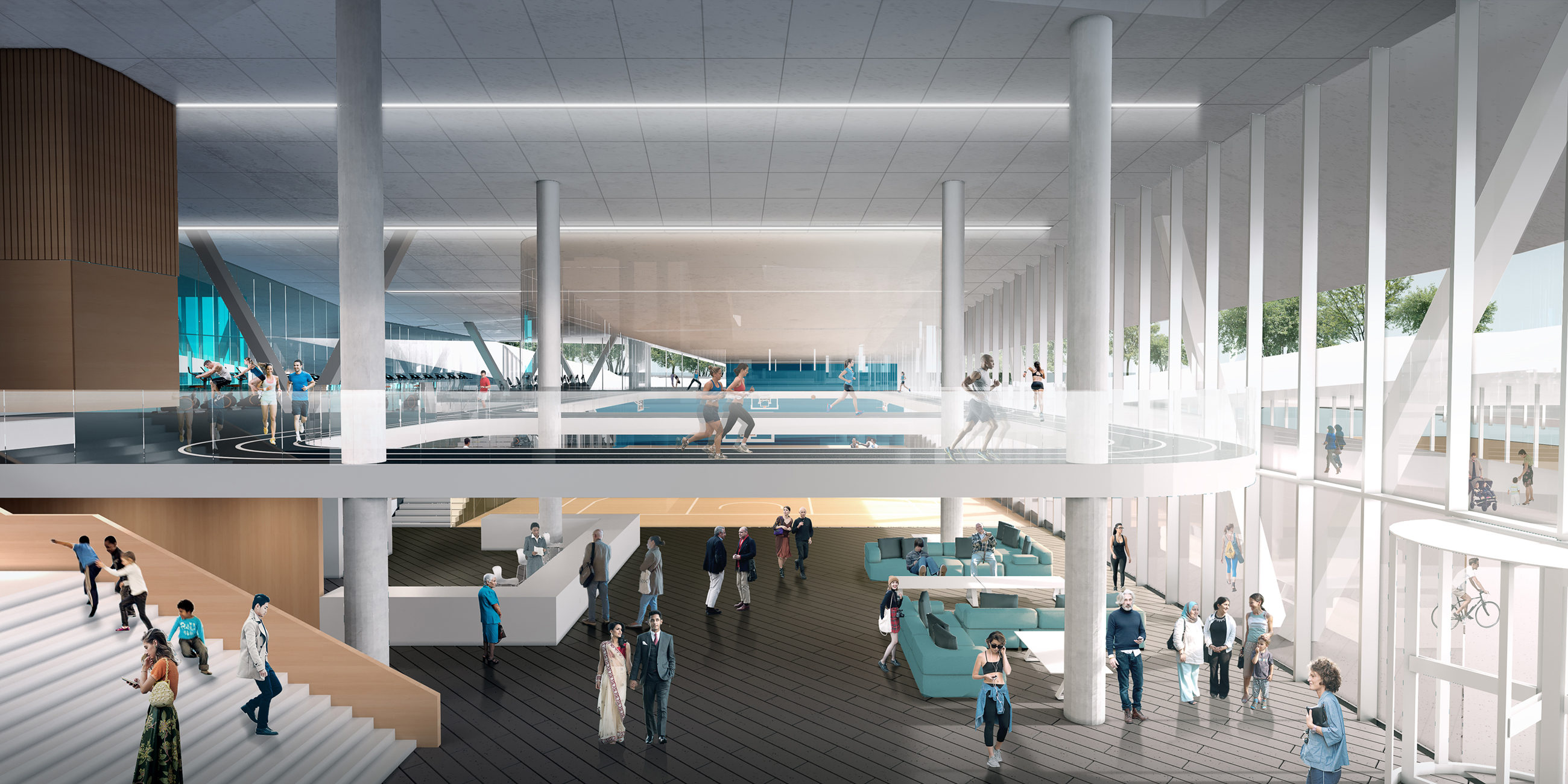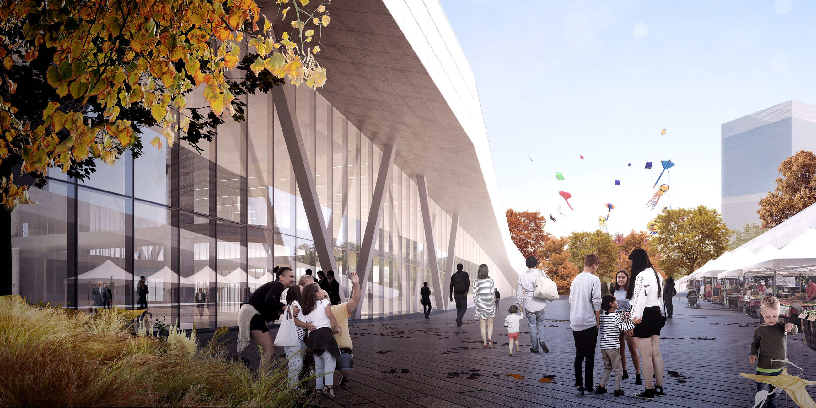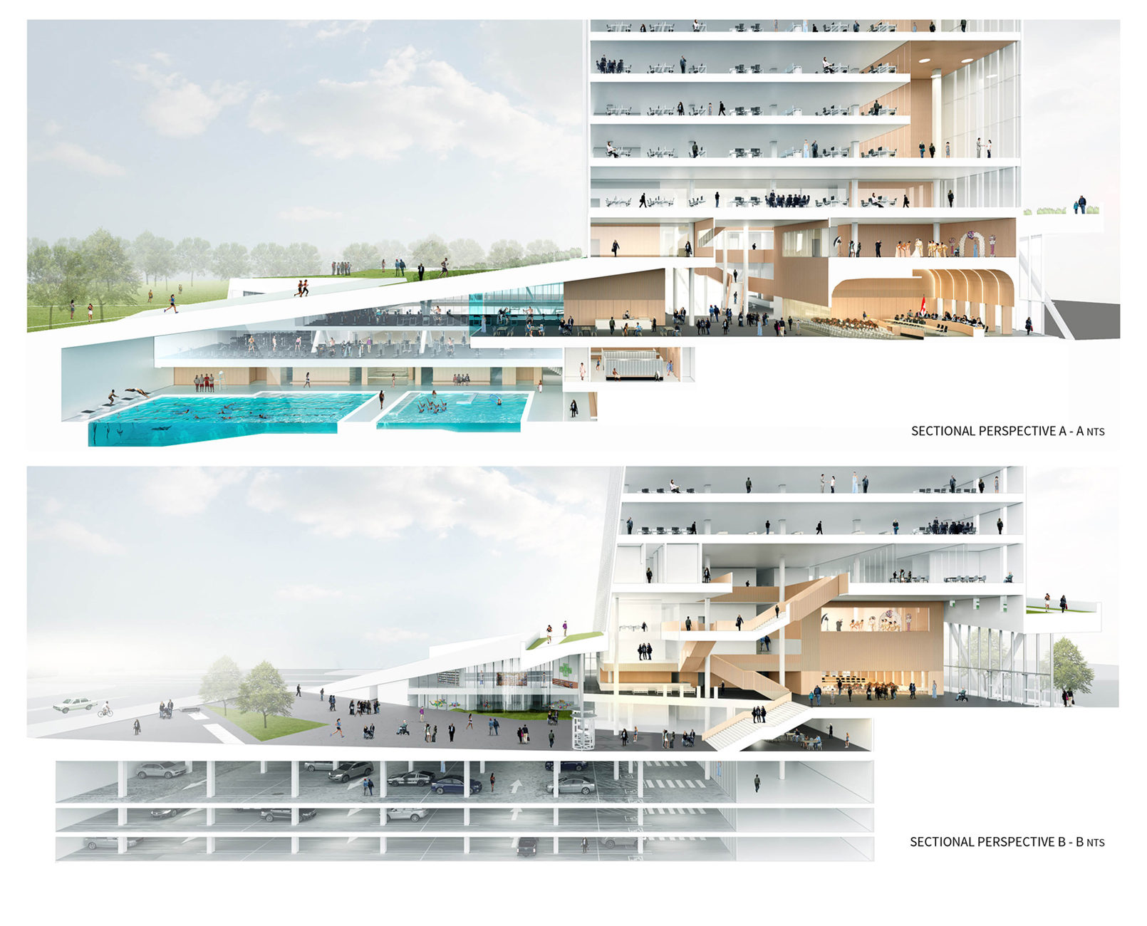 The design for the ECC maximizes open green space to expand and enhance the pedestrian realm by proposing the relocation of park space from another block and consolidating it with the Civic Centre development. The open park space makes direct connections to the building through an extended occupiable green roof that shelters the recreational, library and daycare components. This contiguous public space allows the energy of the civic and recreational program to cross-fertilize creating a continuous civic landscape animated by the active programs.