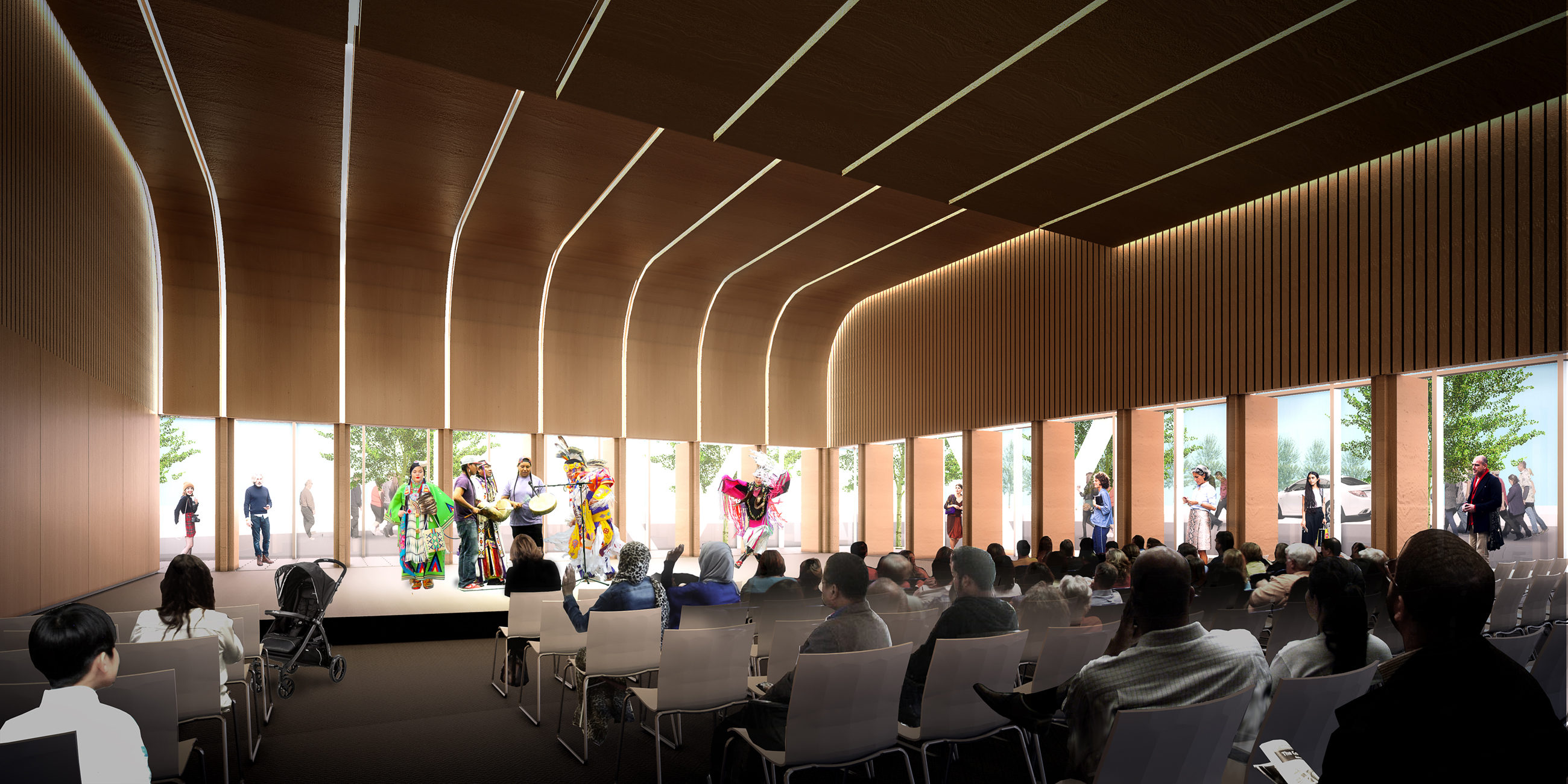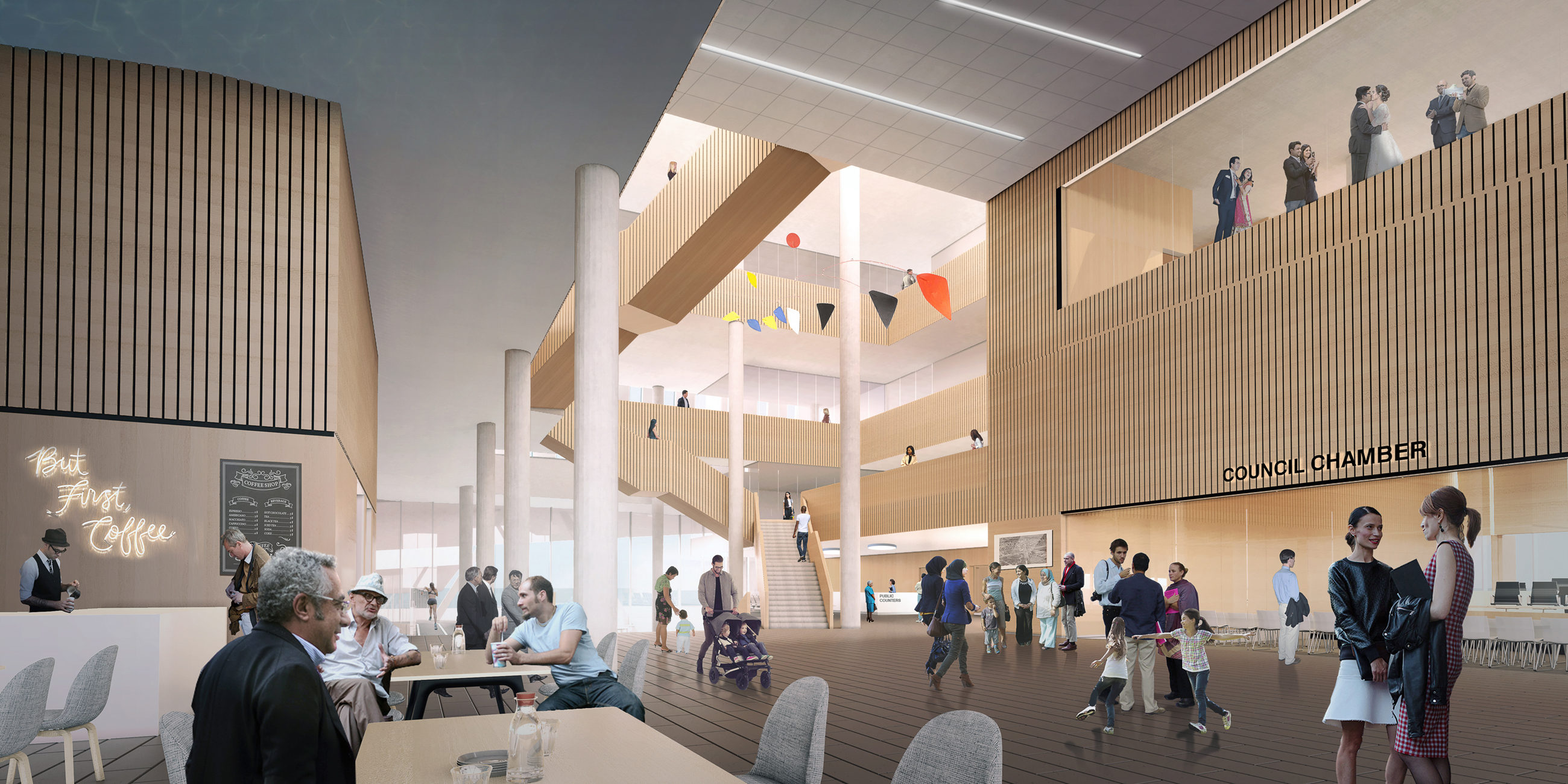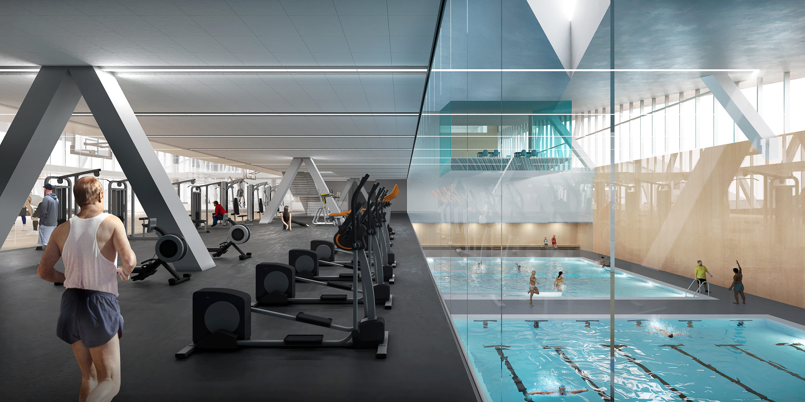 The design for the ECC maximizes open green space to expand and enhance the pedestrian realm by proposing the relocation of park space from another block and consolidating it with the Civic Centre development. The open park space makes direct connections to the building through an extended occupiable green roof that shelters the recreational, library and daycare components. This contiguous public space allows the energy of the civic and recreational program to cross-fertilize creating a continuous civic landscape animated by the active programs.