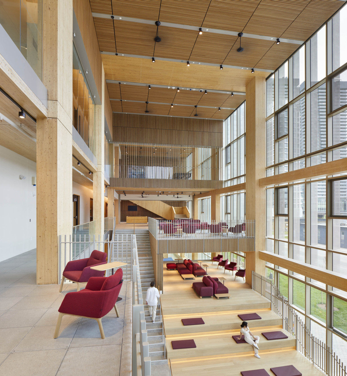 Designed by Moriyama Teshima Architects in joint venture with Acton Ostry Architects, the ten-storey structure brings together the college’s School of Architectural Studies, the Tall Wood Research and Innovation Institute, and a mix of classrooms, wellness spaces, childcare, and event facilities. The result is a vibrant, student-centred environment that fosters creativity, collaboration, and connection.