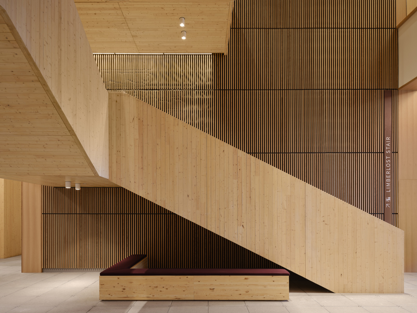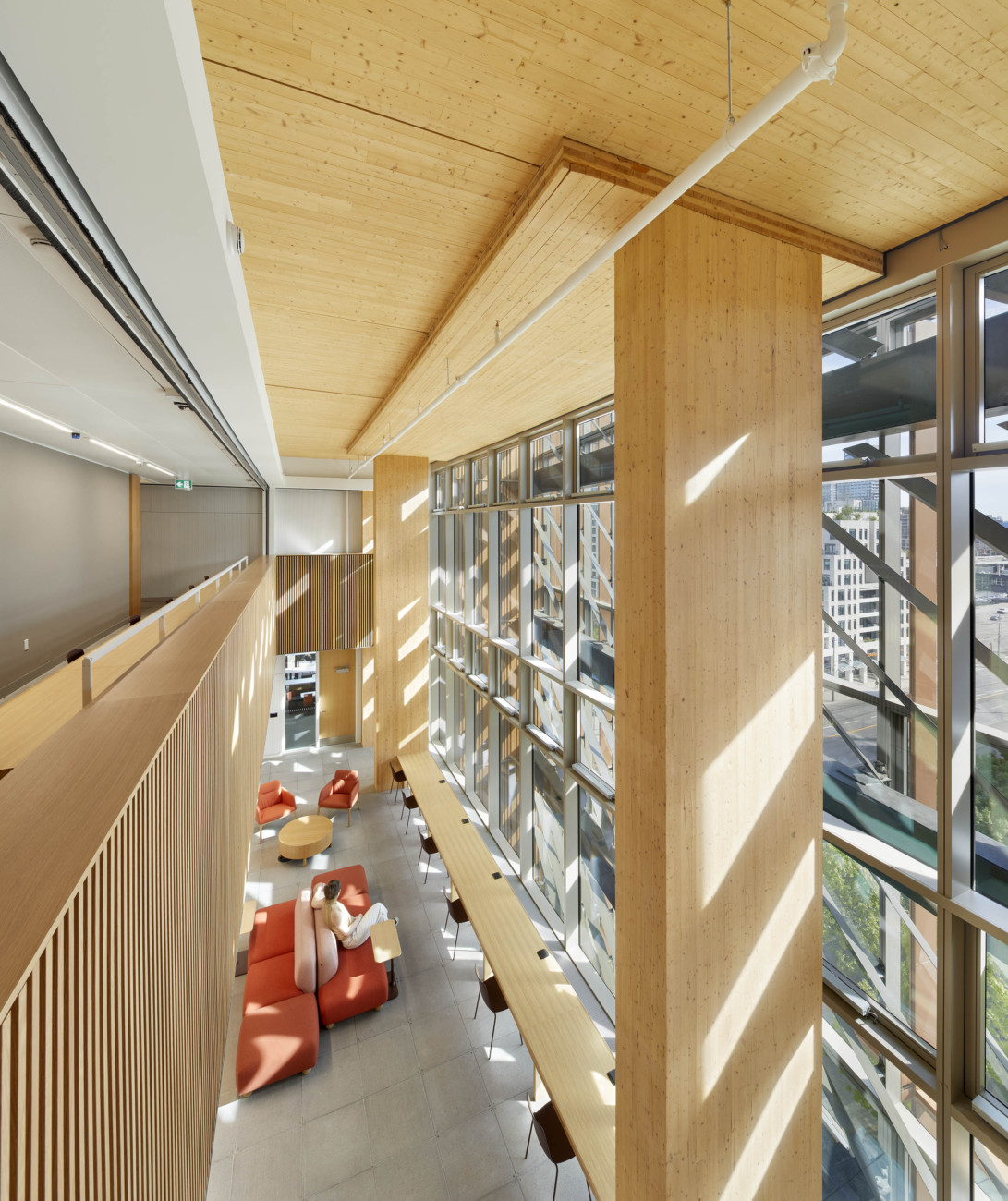 Within the building, the triple-height Learning Landscape anchors the interior as a social commons filled with daylight, seating, and warm timber finishes. Two solar chimneys provide natural ventilation, while a beamless nine-metre grid allows open, flexible layouts that adapt to evolving needs. Throughout, exposed spruce columns and visible sustainability systems invite occupants to engage with the building’s material and environmental performance.