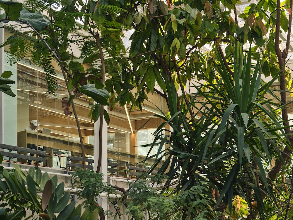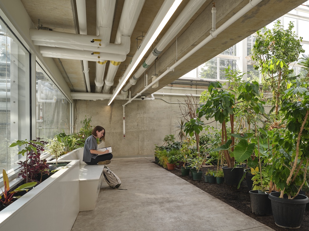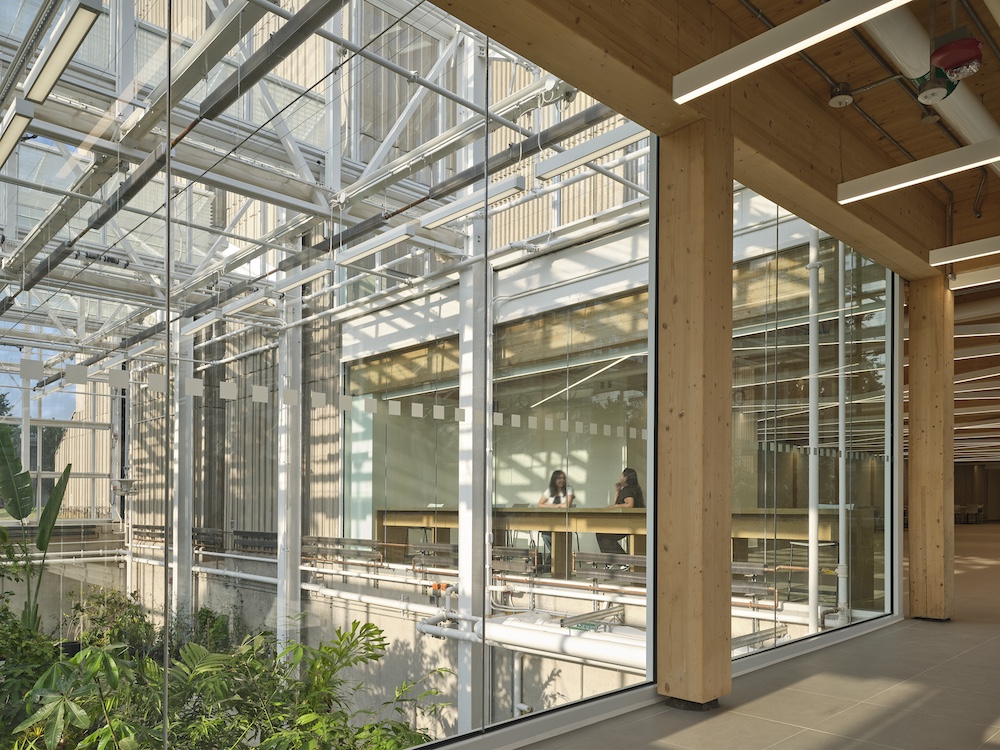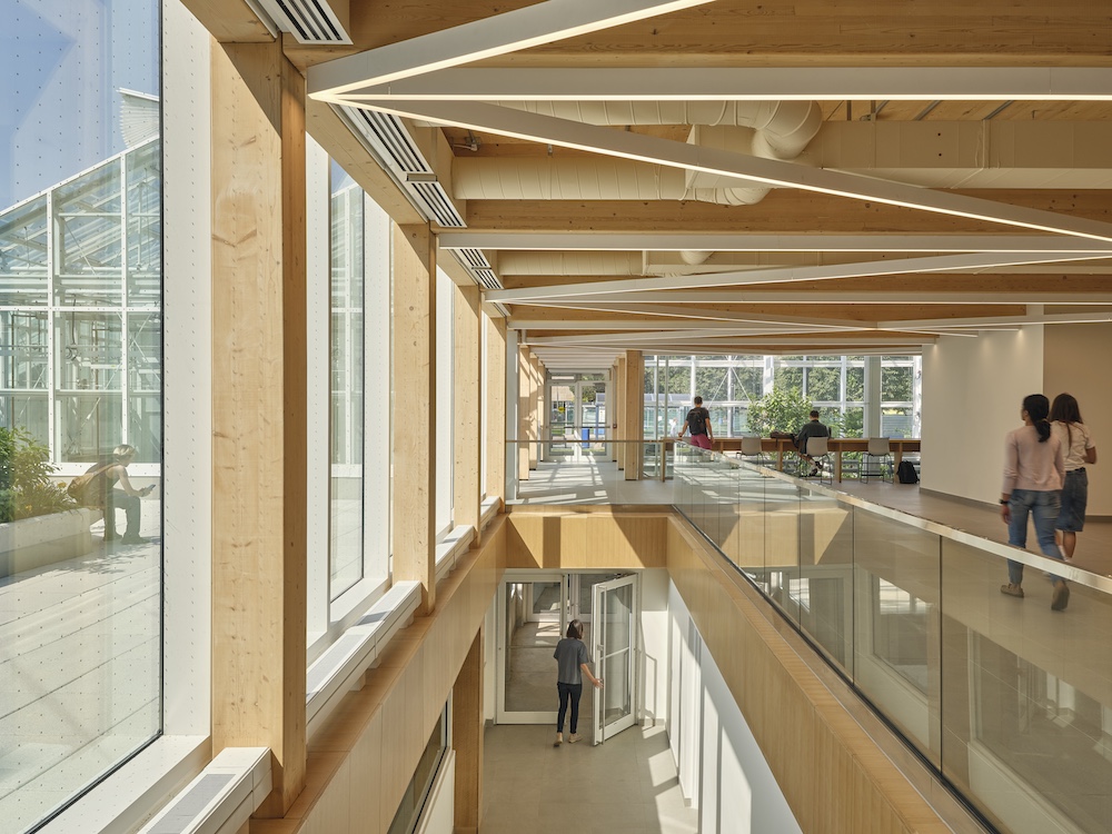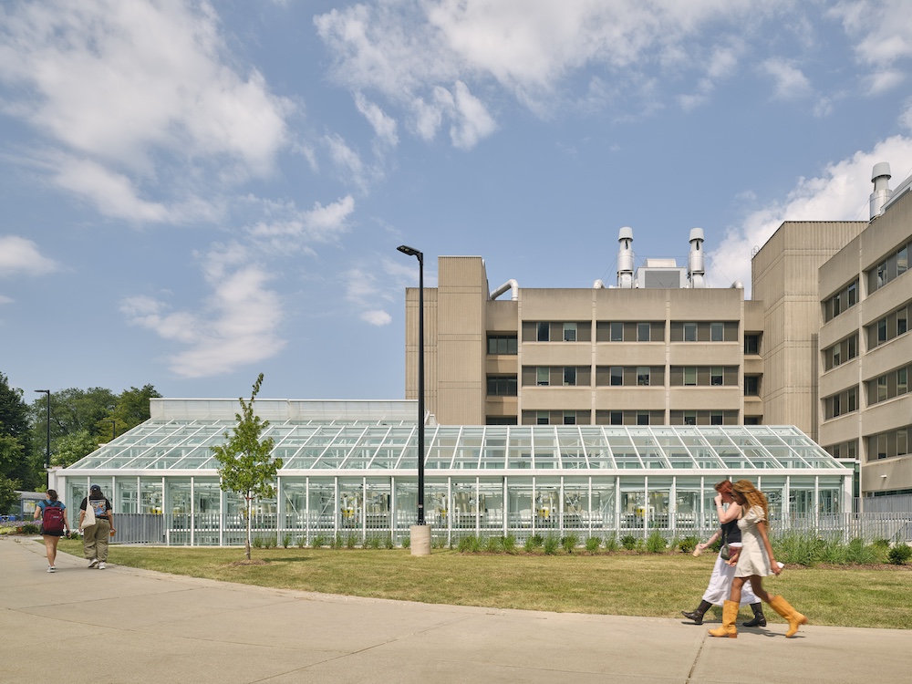 Phase 1 included the integration and addition of a new research greenhouse onto the existing building, new limited electrical and mechanical upgrades in Life Sciences Biology Building, and new lobby and hallway upgrades at the connection to LSB and surrounding landscape. Landscape elements were integrated with the building, drawing people closer and creating a welcoming outdoor forecourt. This dramatic new entrance experience brings occupants through the main entry onto a suspended bridge hosting views onto the two-storey greenhouse space below. Environmentally separated from the greenhouse, the glazed bridge acts as an extension of the lobby, integrating wood elements that carry the spatial qualities from the space beyond.