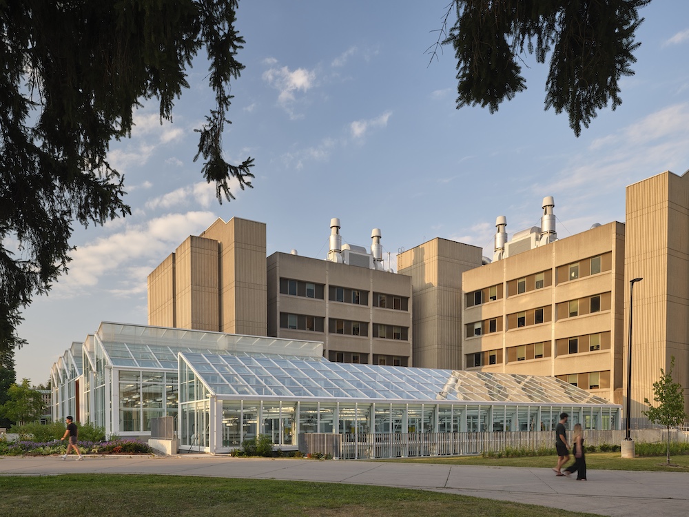 The project was designed to a minimum LEED Silver certification and is to achieve a minimum annual energy consumption saving of 25% when compared with the Model National Energy Code for Buildings (MNECB). The placement of the greenhouse, and subsequent role of the facility, is a vital part of the entry sequence to the LSB Building. Furthermore, with the site’s proximity to the adjacent McMaster University Medical Centre and Hospital, its campus visibility, and its surrounding municipal vehicular routes, the new greenhouse seizes the opportunity to reflect McMaster University’s leadership in the study and research of science and natural systems in health and wellness, as well as echos its commitment to growth, health, and sustainability.
