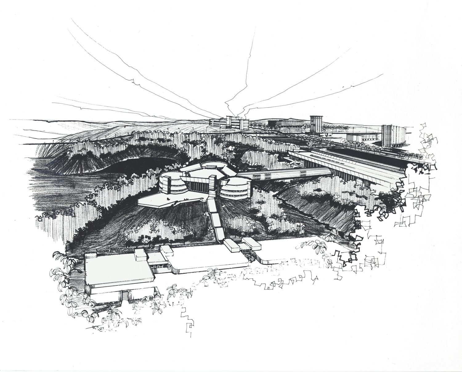 Conceived in the form of a city, the Centre respects the existing trees and configuration of land table, valley, and ravine. Throughout, vistas of the natural landscape are constant reminders that, despite the emphasis on science and technology, nature remains the basis of life.
