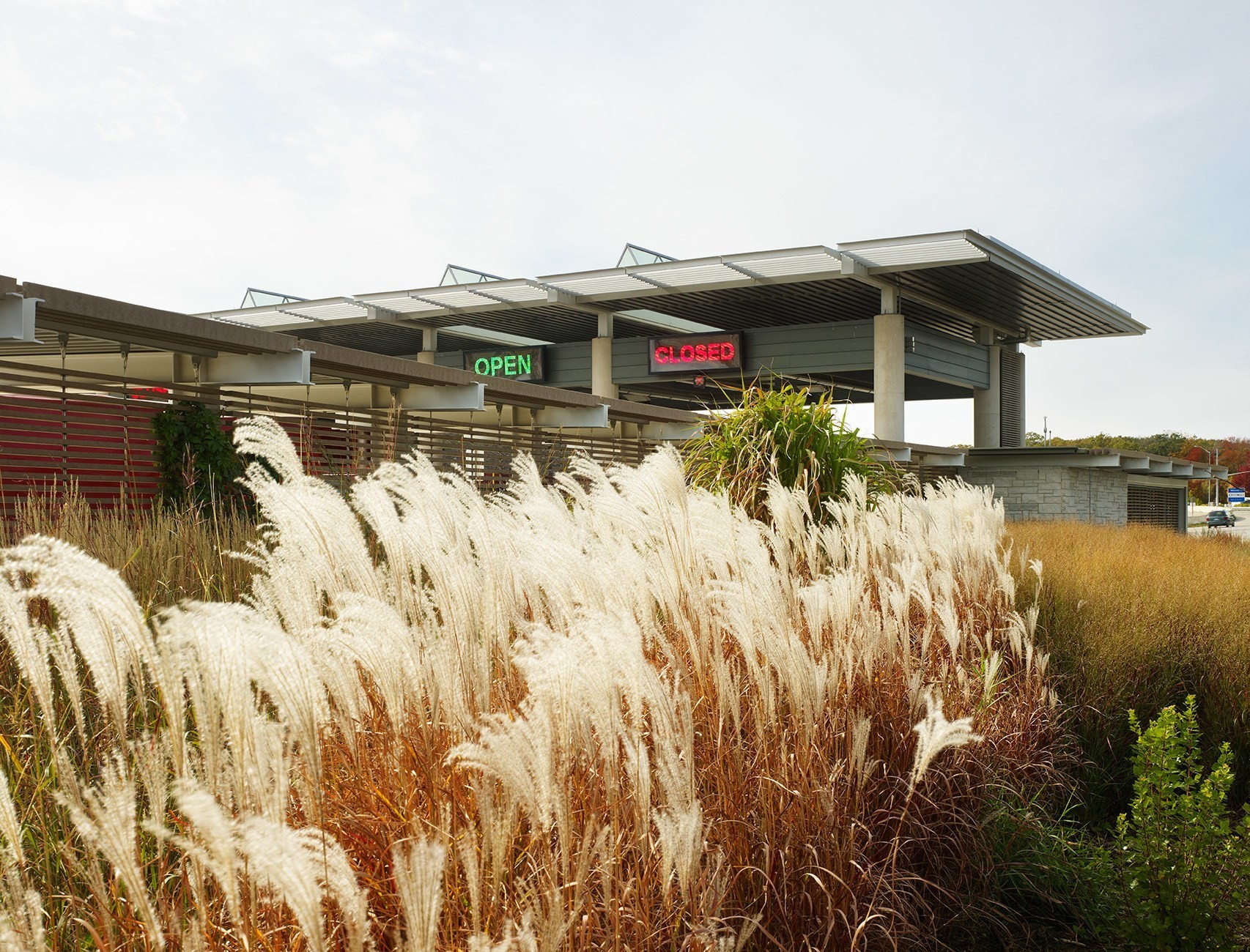Located along the Niagara Parkway, one of Canada’s most visited tourist promenades, the redevelopment included extensive naturalized landscaping consisting of native wild grasses and plantings to create a visual buffer between the plaza and the surrounding Carolinian forest of the Niagara Peninsula.
