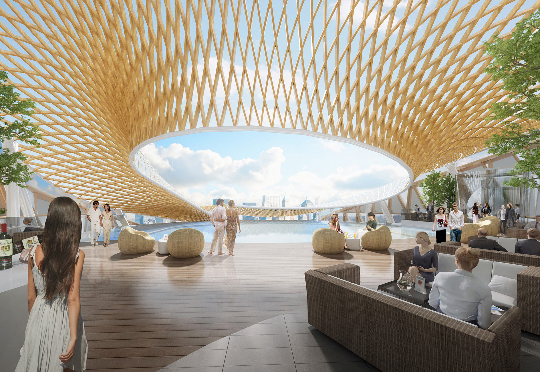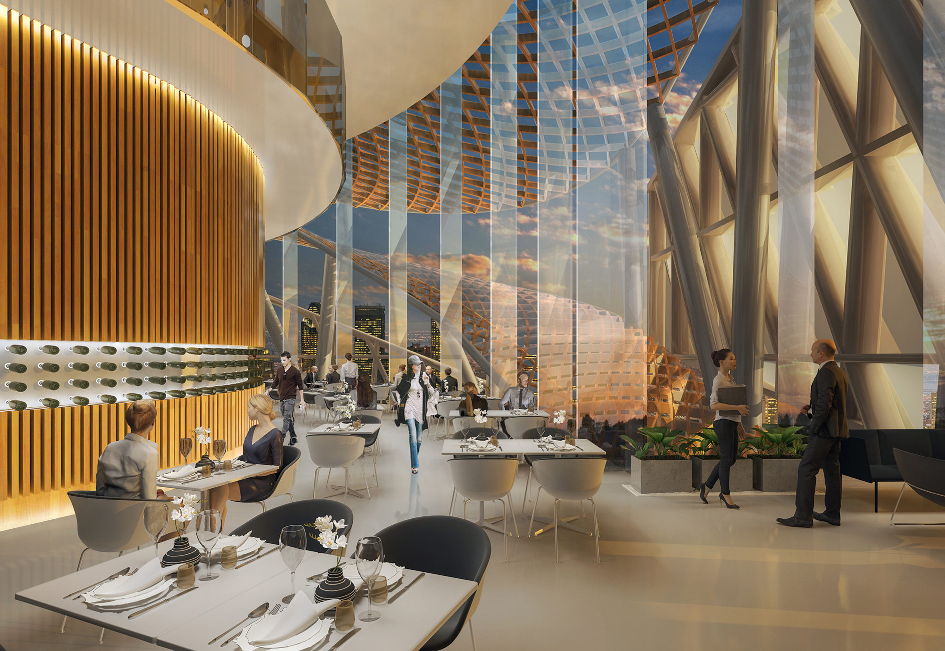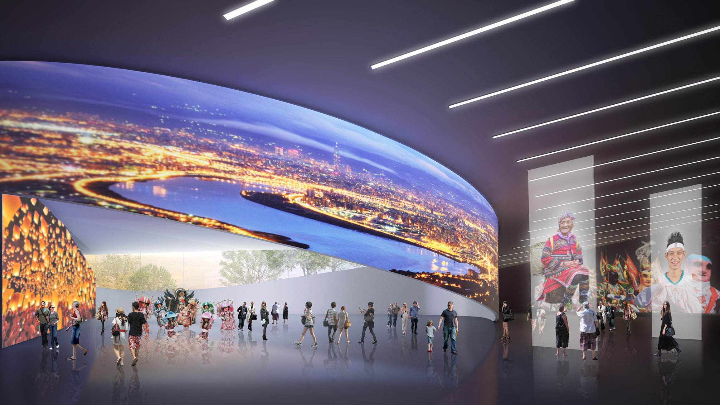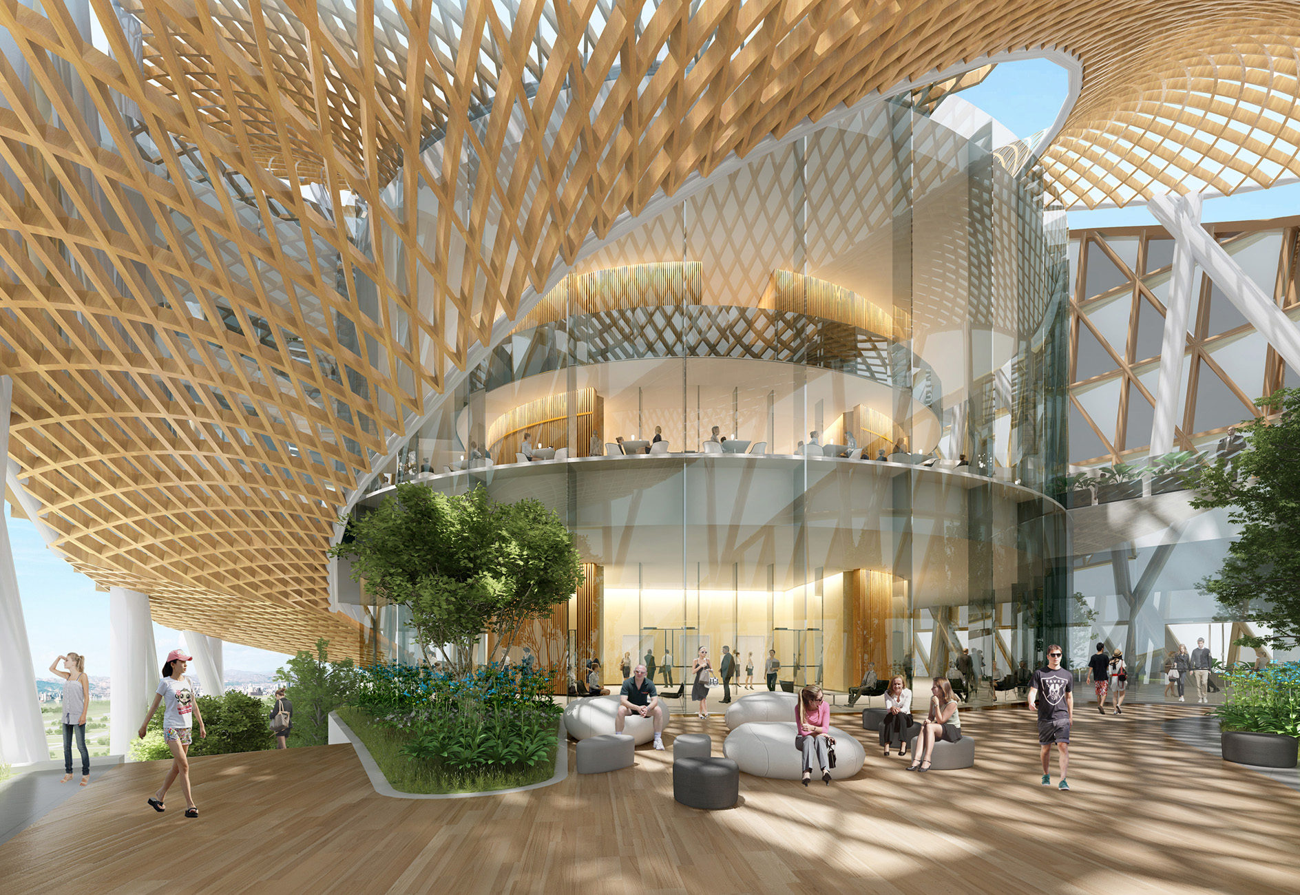 The interior ground level is dedicated to public use, further reinforcing the pedestrian realm from exterior to interior and includes a digital cultural space, a theater, shops, and a dining facility. A dramatic triple story atrium space with a sculpted wood trellis serves as the main public space for the cultural centre while the exhibit space and theater have operable partitions so they can spill directly into the atrium for larger events.