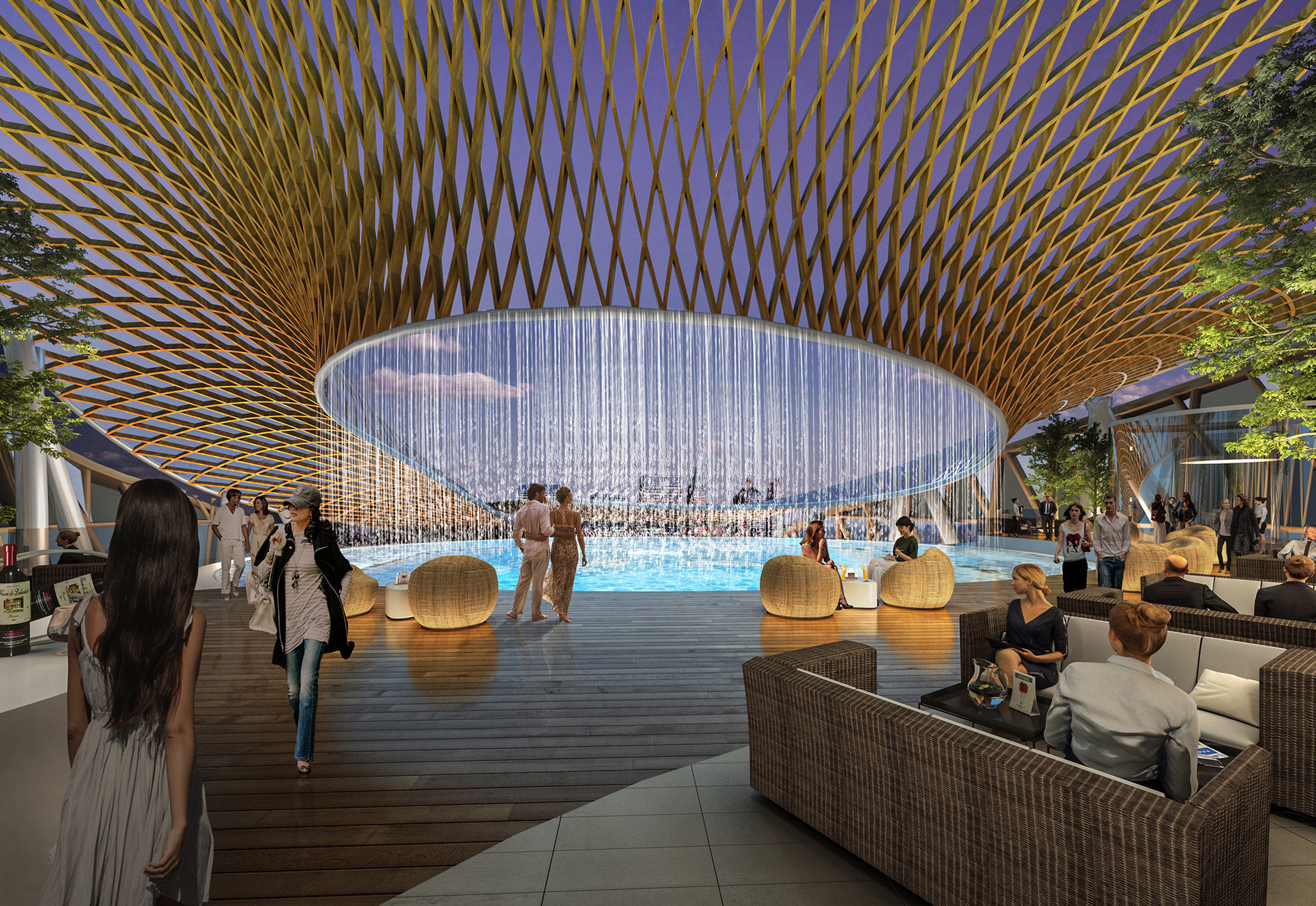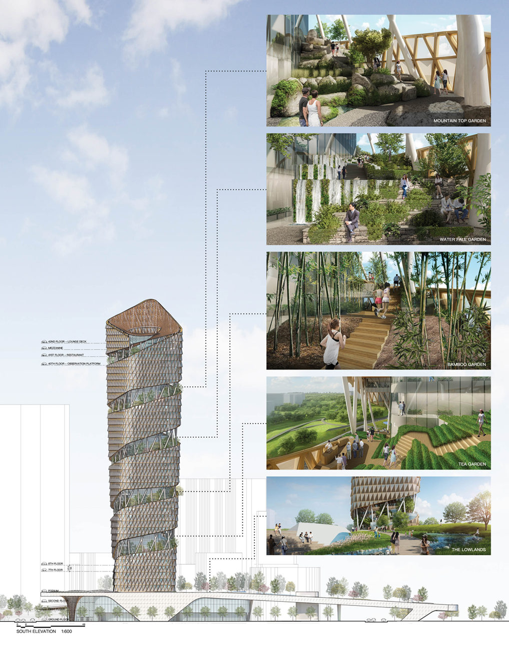 Accessible to the public, the gardens were designed to be a common and inclusive space allowing public access to the intermediate floors which house cafés and indoor resting areas directly outside the designated office areas and lead to the rooftop. This multi-level garden path starts at the podium and ascends to the very top with a a dramatic sculptural canopy and a special water feature that reflects the city and sky. Its interpretive journey allows both building occupants and the public to traverse through the varied elements of Taiwan’s rich and diverse geography, vegetation, culture, and industry, echoing its many wonders and offering unique experiences within an urban setting.