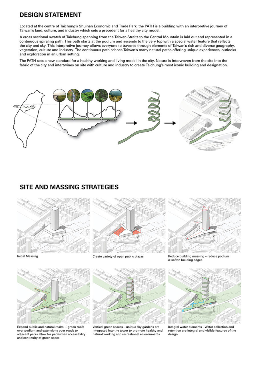 Located at the centre of Taichung’s Shuinan Economic and Trade Park, the vision for the PATH was a mixed-use tower that would set the precedent for a sustainable city model. The vision for the site was inspired by the desire to integrate a generous park space and quality gathering spaces within the public realm.