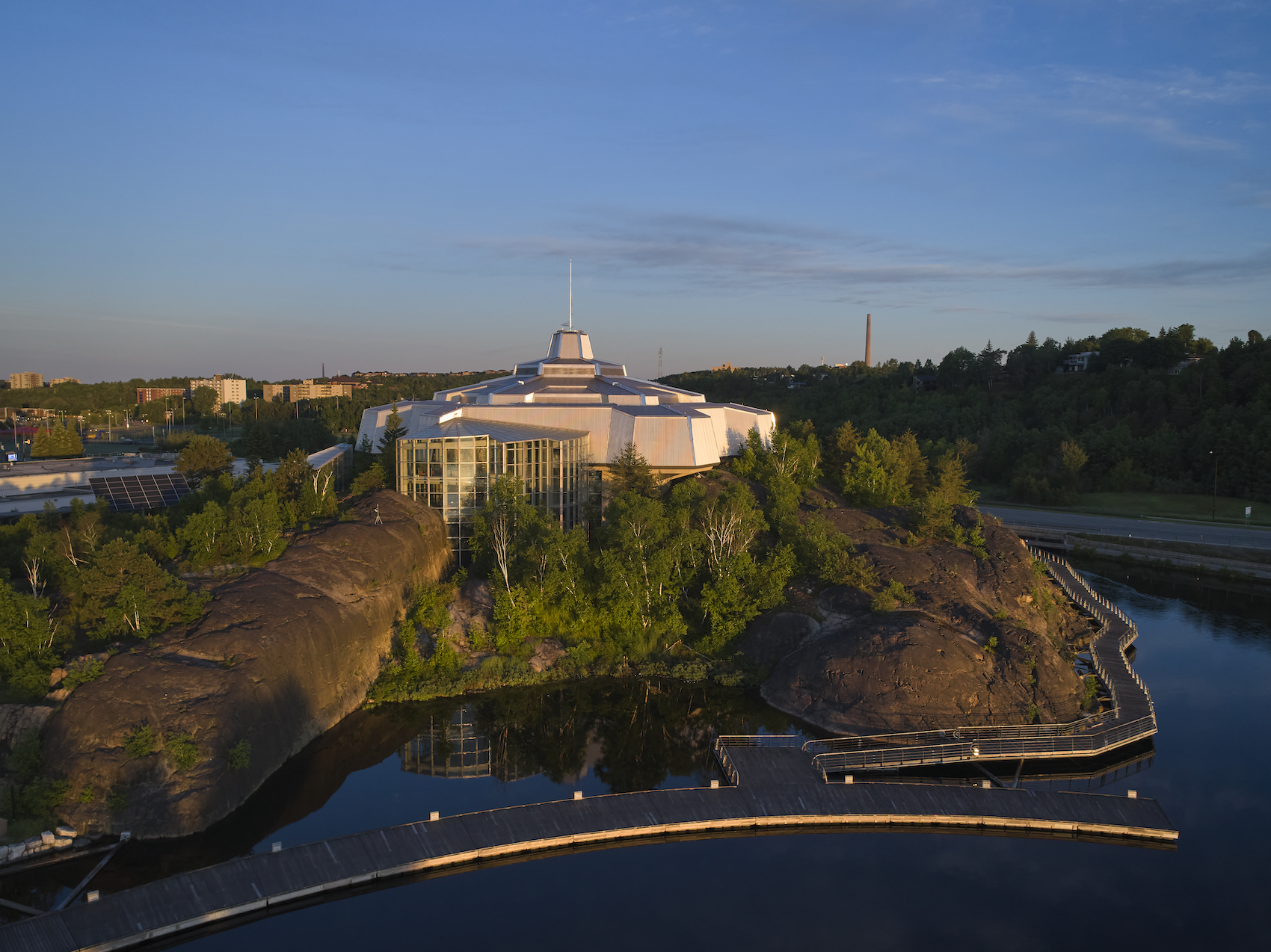 This interactive museum located in Sudbury, consists of two snowflake-shaped buildings on the southwestern shore of Ramsey Lake. The buildings are connected by a rock tunnel, which passes through a billion-year-old geologic fault. This fault line was not known to be under the complex when the site was originally selected and was discovered only during the construction of the building, resulting in a nimble redesign, focused on the unique geology, incorporating it as a central theme. The two buildings are set against a natural waterfront in a park featuring a wharf, beach, and outdoor pavilions, creating a destination experience, that quickly made Science North a core museum linking educational, cultural, and recreational centres across Northern Ontario.