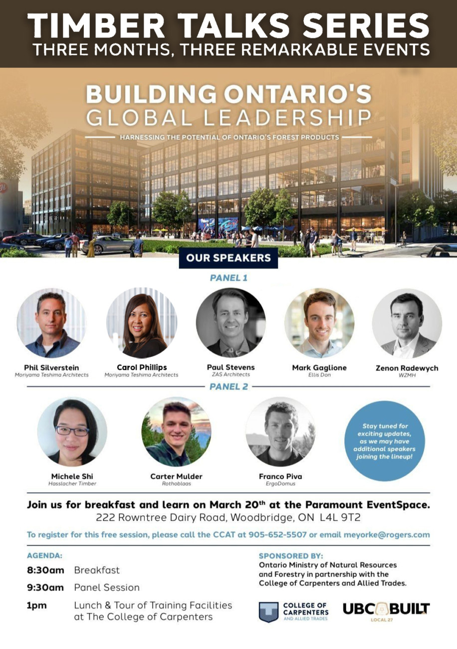 MTA Partner, Carol Phillips, and Principal, Phil Silverstein, will be speaking at the third session of Timber Talks Series, organized by the College of Carpenters and Allied Trades and UBC Built (Local 27, Toronto’s Carpenters’ Union) and sponsored by the Ontario Ministry of Natural Resources and Forestry.