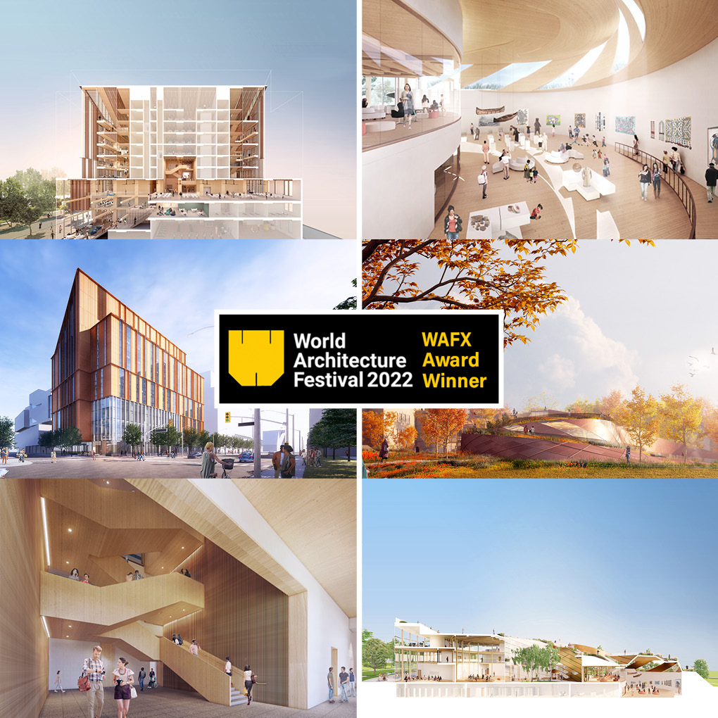Moriyama & Teshima Architects has not one, but two reasons to be celebrating this year’s World Architecture Festival Awards program. Both Limberlost Place at George Brown College, our project with Acton Ostry Architects, and Mukwa Waakaa’igan Indigenous Centre of Cultural Excellence at Algoma University, our project with Smoke Architecture, have won WAFX Prizes, as well as being selected as finalists in the WAF Future Projects – Education Award category.