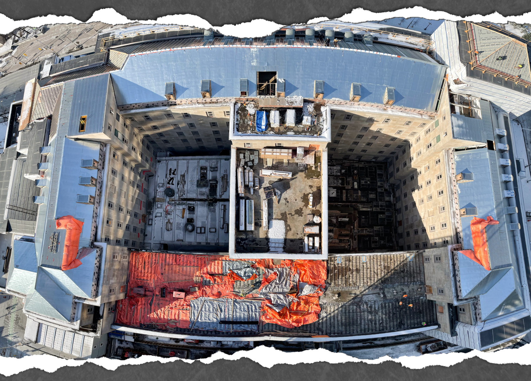 From this vantage point, we can see the copper roof installation underway, as well as both existing courtyard spaces. The west lightwell (left side of photo) will be infilled with the Supreme Court of Canada. The east lightwell (right side of photo) will be the heart of the revitalization, a new grand hall serving as the building’s primary arrival point. These two feature spaces within the building will eventually be enclosed by expansive glass skylights.