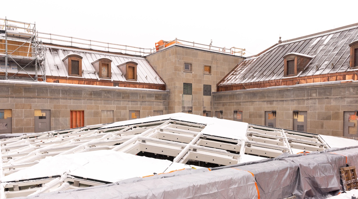 Glass and steel are instrumental elements comprising the structural system and finishes of the overhead skylights capping these spaces. The design of which is truly innovative, consisting of diagonally intersecting steel beams, creating a long-span structure that is both efficient and aesthetically pleasing. These dynamic photographs of the skylights were taken by Salina Kassam on site back in December 2023.