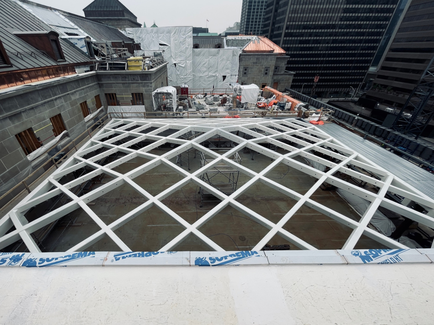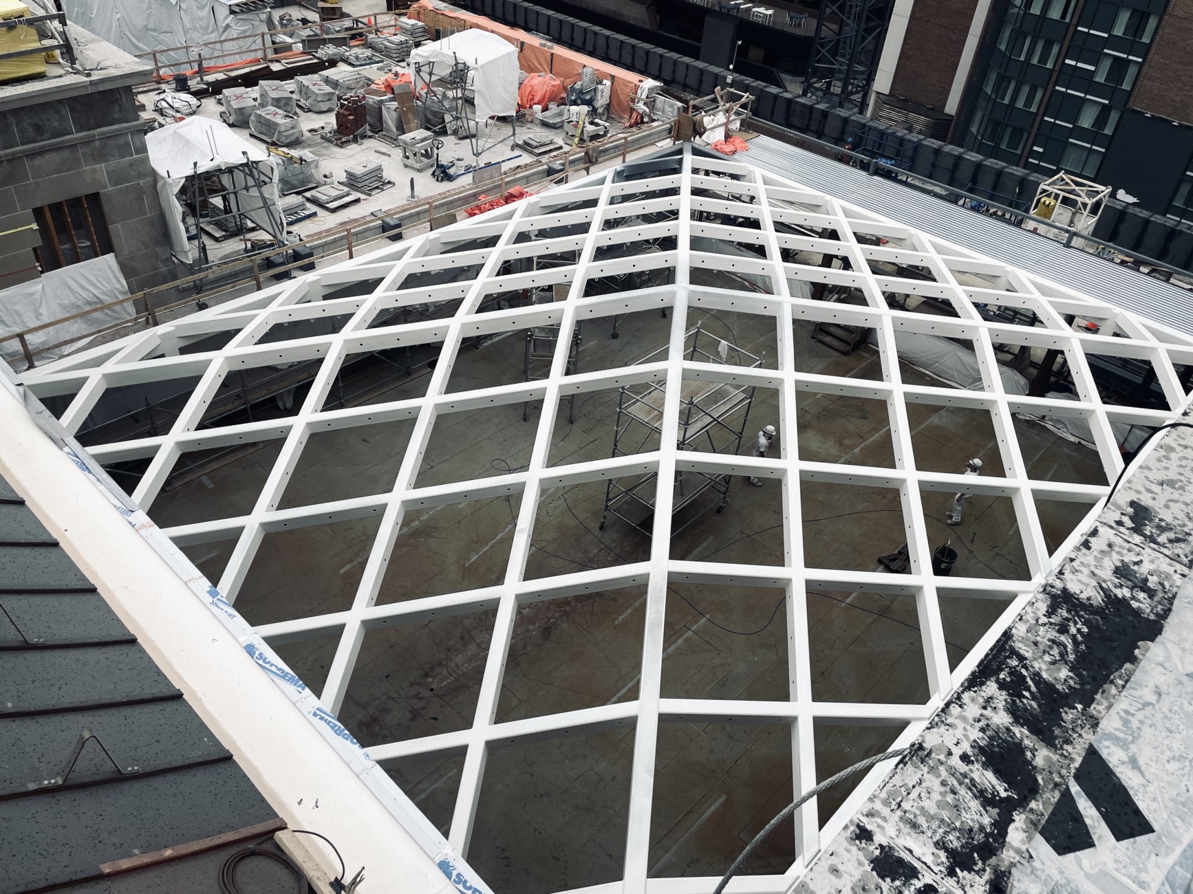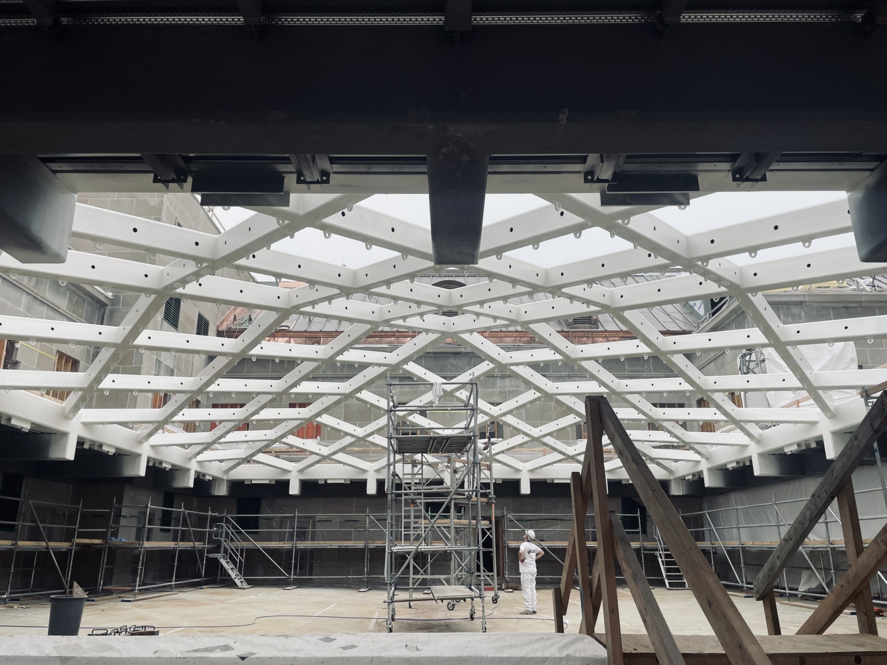 The overhead skylight of the West Memorial Building Rehabilitation project’s lightwells have seen a slight change in aesthetic lately, with a new coat of paint on the steel framing. This uniform white tone has introduced a new feeling of lightness and elegance to the structure, brightening the spaces below.