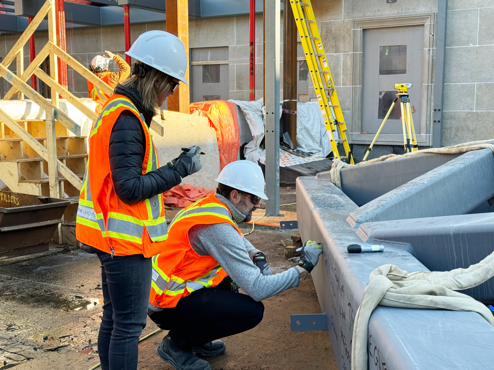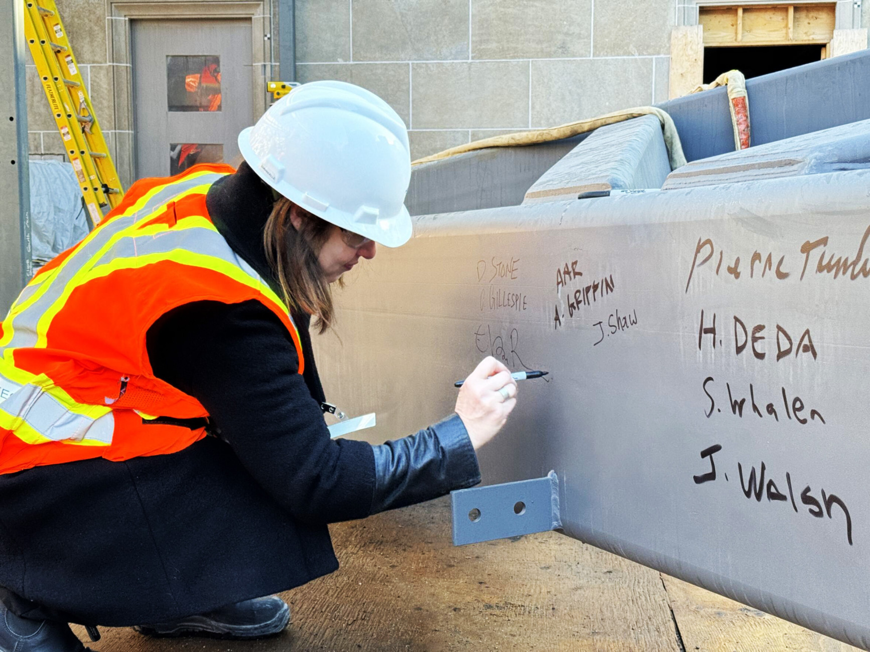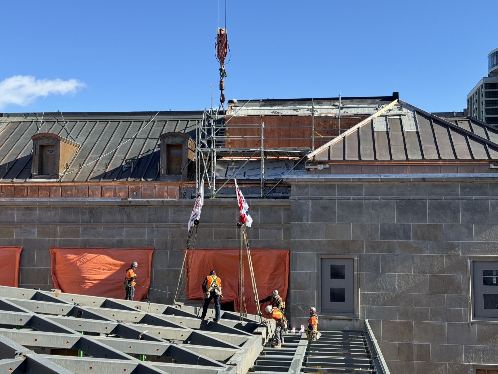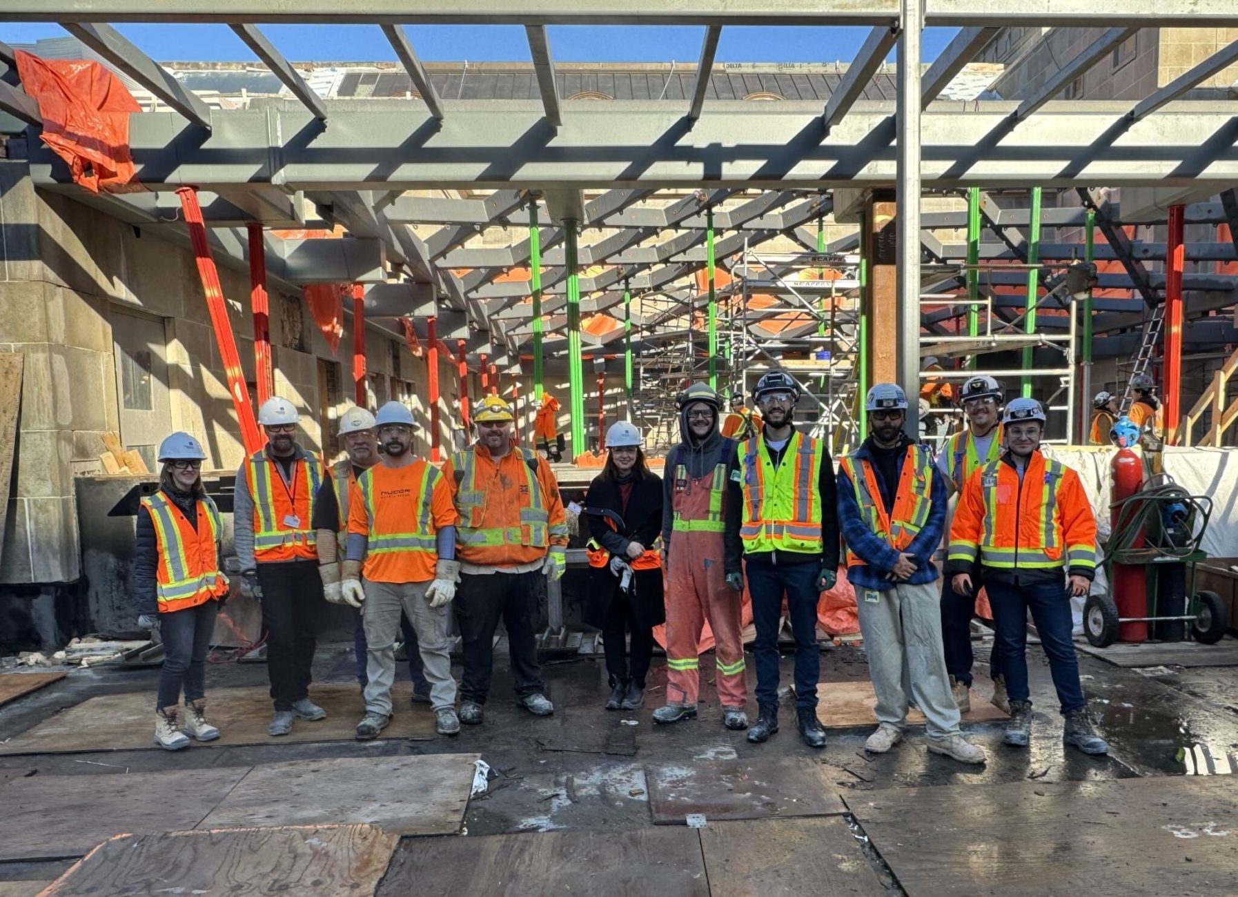 The West Memorial Building Rehabilitation project team gathered on site for a ceremony celebrating the hoisting of the final piece of structural steel! A major modernization and restoration of a Classified Federal Heritage Building, this iconic landmark is located in downtown Ottawa. The particular steel member, which was lifted on Monday, is the last portion to be set in place in the east courtyard skylight frame.